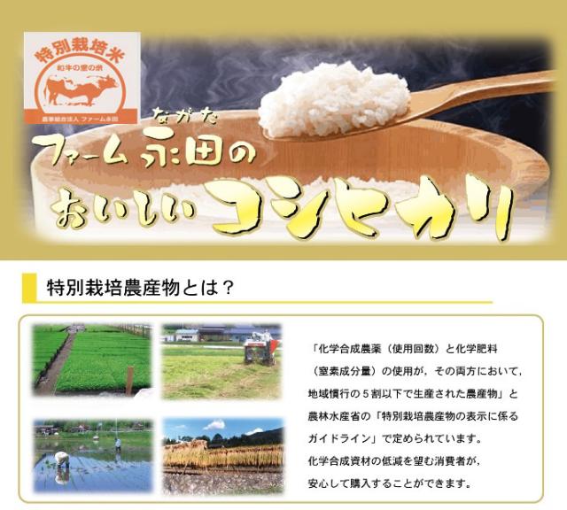 | 広島県庄原市口和町永田というところにある「農事組合法人ファーム永田」様が生産された"ファーム永田のおいしいコシヒカリ"です。 ■特別栽培米とは? 「化学合成農薬(使用回数)と化学肥料(窒素成分量)の使用が,その両方において,地域慣行の5割以下で生産された農産物」と農林水産省の「特別栽培農産物の表示に係るガイドライン」で定められています。 化学合成資材の低減を望む消費者が,安心して購入することができます。