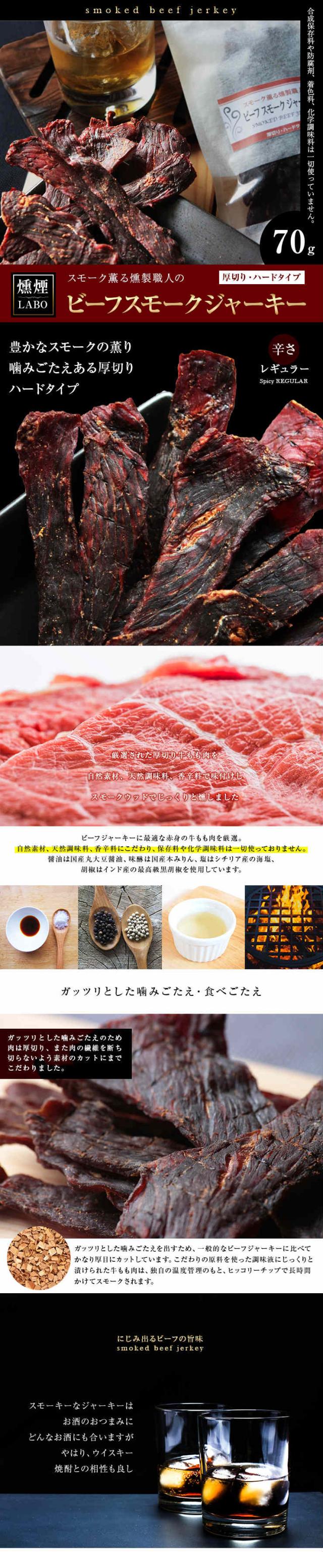 ・厳選された厚切り牛もも肉を、自然素材、天然調味料、香辛料で味付けし、ヒッコリーのスモークチップでじっくりと燻しました。(辛さ・レギュラー)