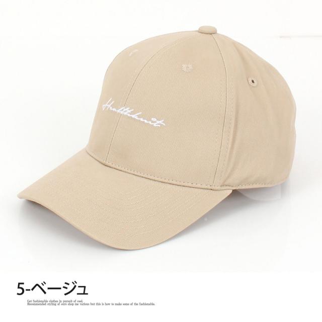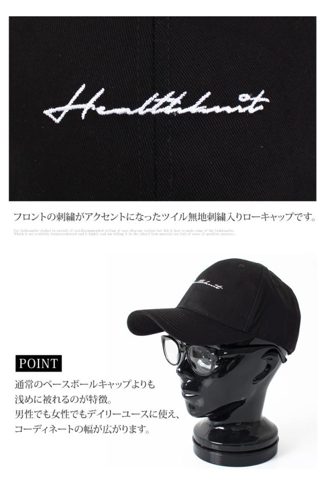 バックのストラップ部分にHealthknitのロゴ入り!フロントの刺繍がアクセントになったツイル無地刺繍入りローキャップです。