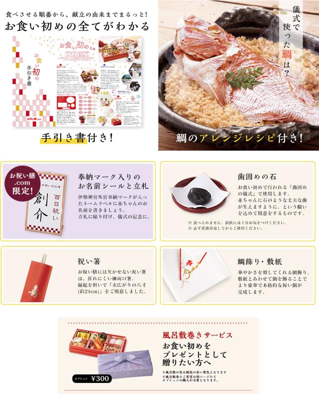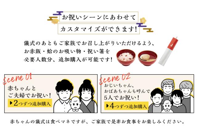 | 原材料 | ●お食い初め膳6マスは別途資料参照 ●鯛:真鯛、塩(※季節や漁獲量によっては異なる調味料[酒、醤油、穀物酢、ベニコウジ色素、(原材料の一部に大豆、小麦を含む)]を使用する場合がございます) ●赤飯[小豆]:もち米(国産)、小豆(国産)、食塩、着色料 ●赤飯[甘納豆]:もち米(国産)、甘納豆[砂糖、小豆(国産)、還元水飴]、食塩、着色料 ●蛤:千葉県九十九里産はまぐり1粒約35g ●お吸い物:約2.5g、食塩、麩、ねぎ、のり、調味料(アミノ酸等)、香料 ●歯固め石:新那智黒石(自然玉)磨きタイプ 約3〜4cm ※天然石の為大きさや形に個体差があります ●祝箸:【箸袋】無蛍光奉書/【箸】柳 |