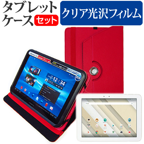 京セラ Qua tab QZ10 au 10.1インチ 機種で使える 360度回転 スタンド機能 レザーケース 赤 と 液晶保護フィルム 指紋防止 クリア光沢 セット ケース カバー 保護フィルム メール便送料無料