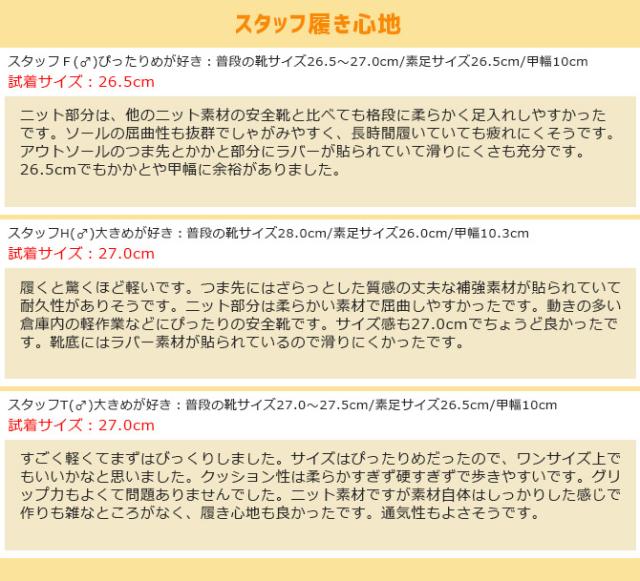 | 素材 | ○甲被:ニット+合成皮革 ○底:EVA+ラバー ○先芯:樹脂先芯 | |||||