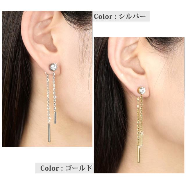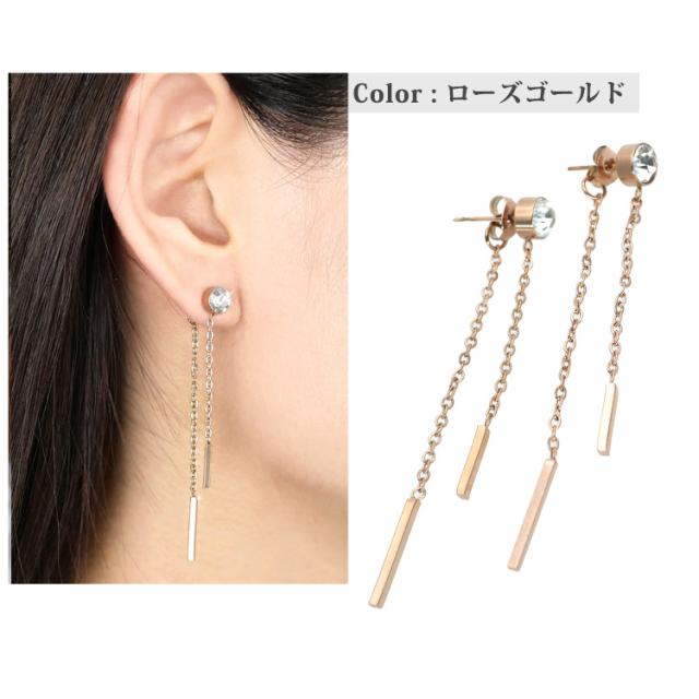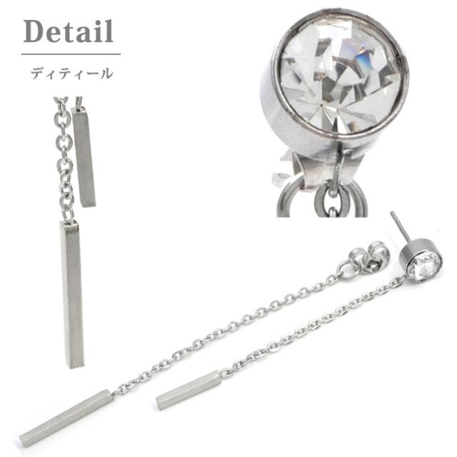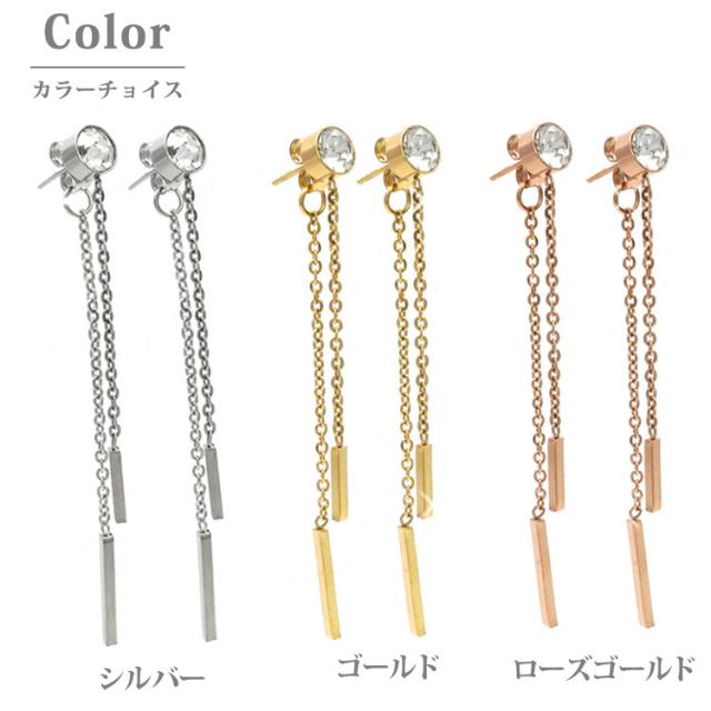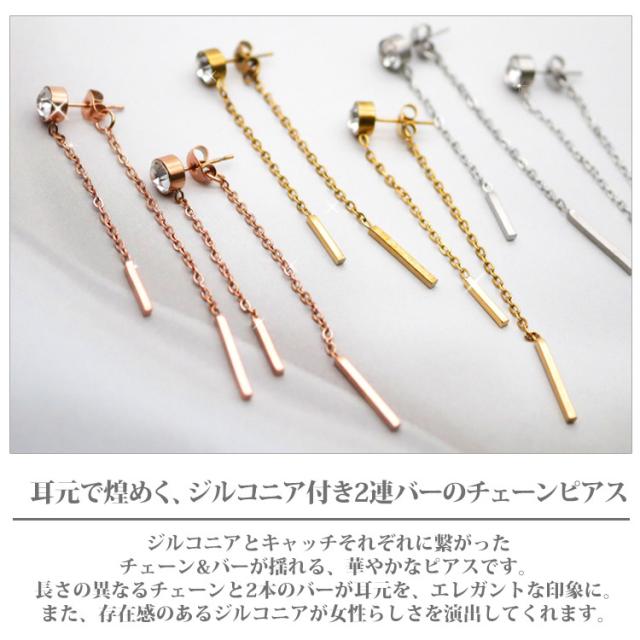 ジルコニアとキャッチそれぞれに繋がったチェーン&バーが揺れる、華やかなピアスです。長さの異なるチェーンと2本のバーが耳元を、エレガントな印象に。また、存在感のあるジルコニアが女性らしさを演出してくれます。普段使いや、デート、パーティーなどにもお使い頂ける、シーンを選ばないアイテムです。素材には、金属アレルギーの方にも安心なサージカルステンレスを使用。使い勝手の良さとデザインが魅力的なステンレスピアスを是非お試しください。シルバーやホワイトゴールド、プラチナで金属アレルギーが出てしまう方にもオススメです。