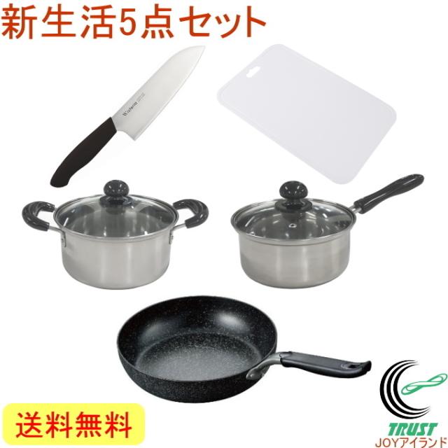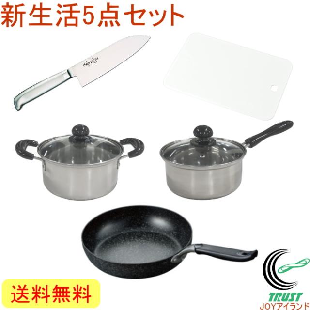 新生活応援5点セット 送料無料 三徳包丁 片手鍋16cm 両手鍋18cm ソフトまな板 フライパン26cm なべ