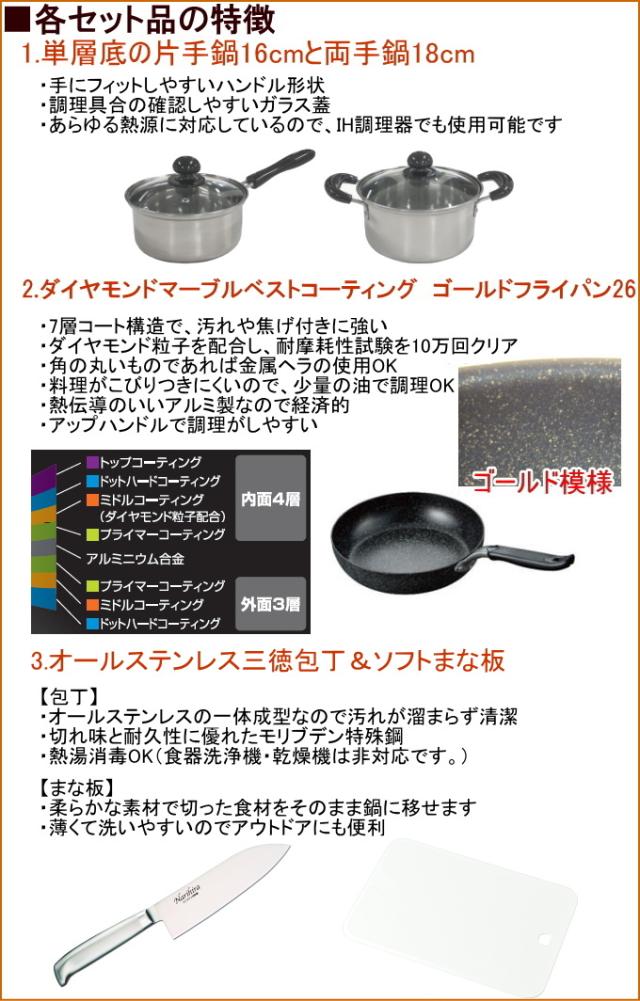 ■三徳包丁 刀身:ステンレス刃物鋼、ハンドル:ポリプロピレン ■単層底(ガラス蓋)片手鍋16、両手鍋18 本体:ステンレス鋼(クローム16%)(板厚0.4mm) ハンドル:フェノール樹脂(耐熱温度150度) フタ:物理強化ガラス ■ダイヤモンドマーブルベストコーティング「ゴールド」フライパン26cm 本体:アルミニウム合金(2.3mm厚) はり底:ステンレス鋼(0.5mm厚)、(底の厚さ:2.8mm) 取っ手:フェノール樹脂(耐熱温度150度) 表面加工:内外面ともにフッ素樹脂塗装加工 ■ソフトまな板 ポリエチレン |