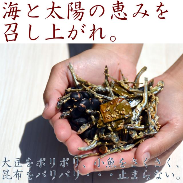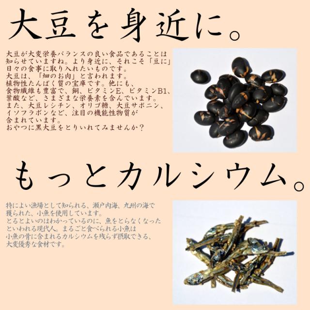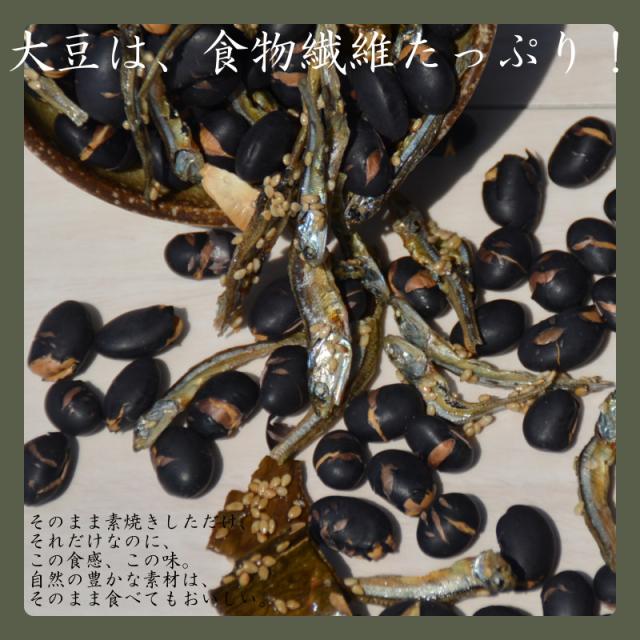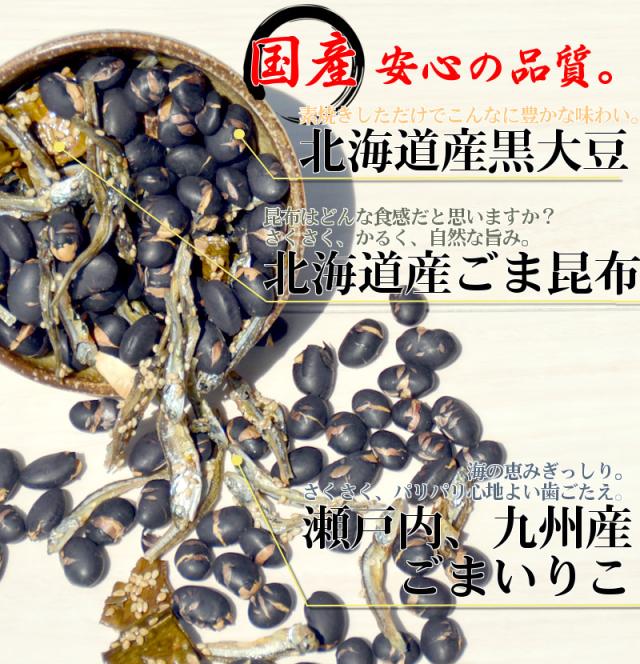 ■原材料名 黒大豆(北海道産)、煮干し(いわし(国産)、食塩)、砂糖、ごま、昆布(北海道産)、澱粉分解物、しょうゆ、食塩/トレハロース、調味料(アミノ酸等)、(一部に小麦・大豆・ごまを含む)
