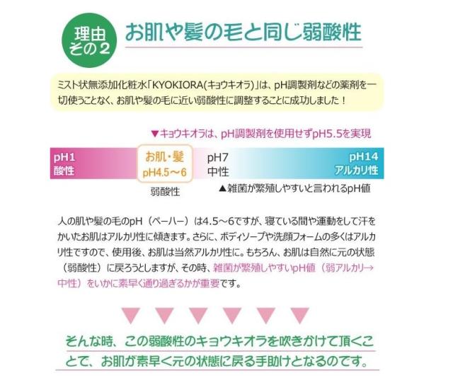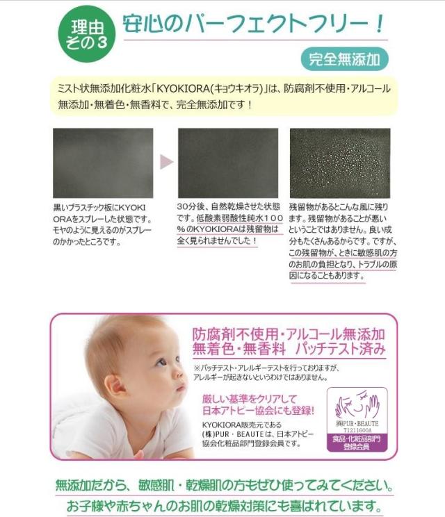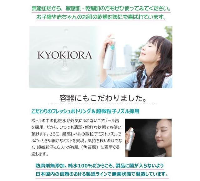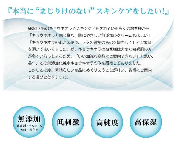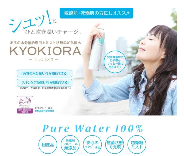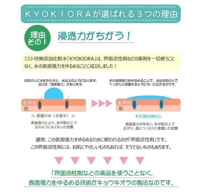 1.完全無添加化粧水のキョウキオラが肌にピュアな潤いを与えます。
