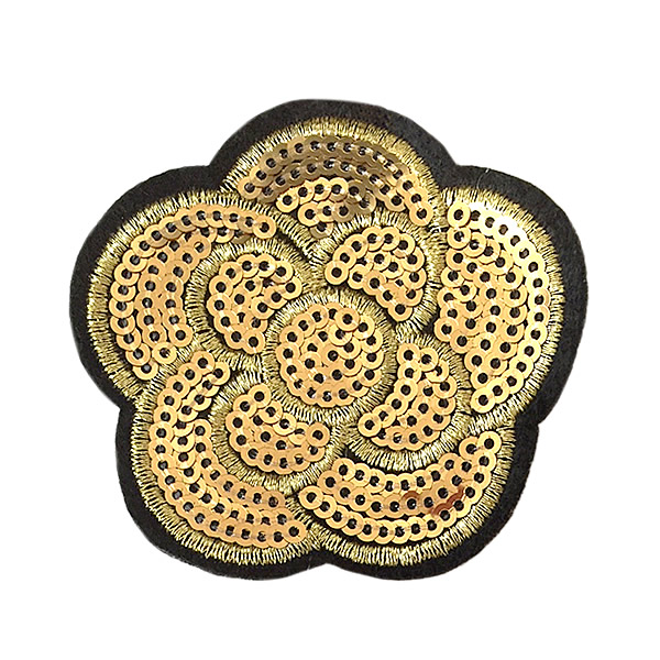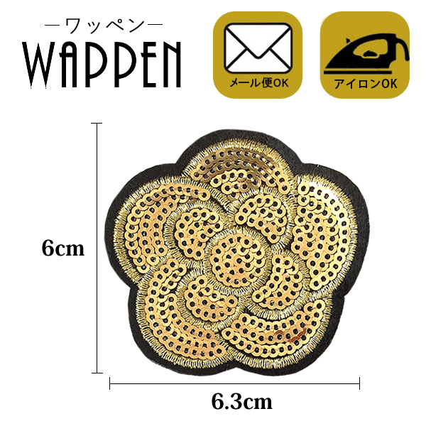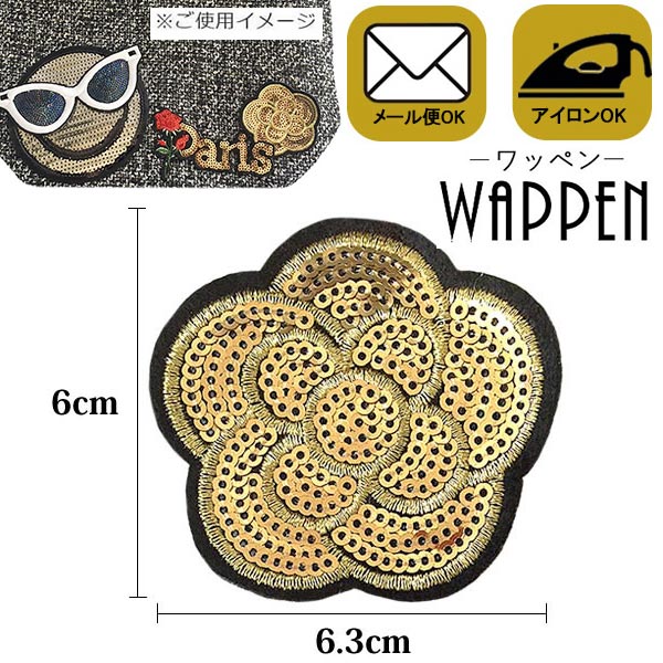 ワッペン スパンコールワッペン アイロン接着 縦6cm×横6.3cm カメリア ゴールド 花 フラワー キラキラ アップリケ母の日 プレゼント ギフト