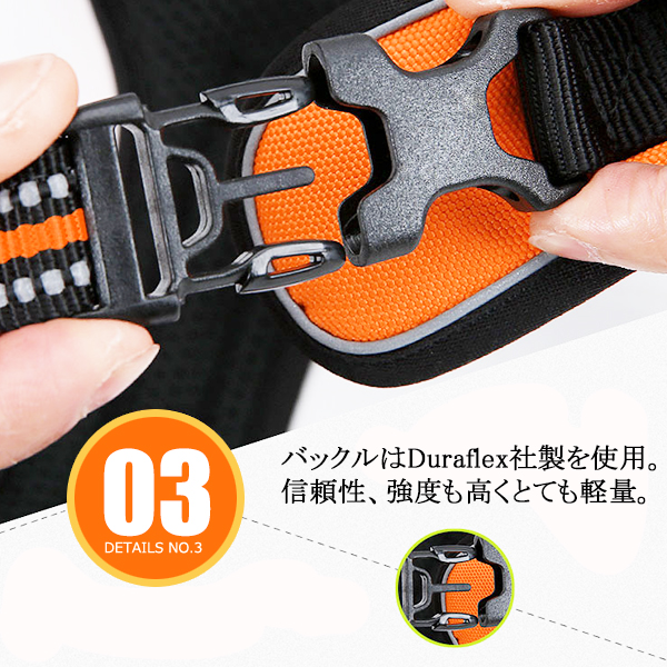 全方位固定型で、4つのアジャスターと2つのバックルでガッチリ固定。