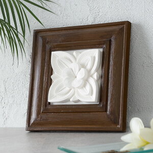 木製フレーム付きプルメリアモチーフのストーンレリーフ