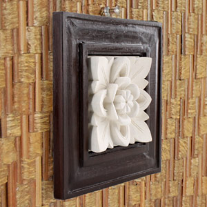 木製フレームを組み合わせたストーンレリーフ。立体的で、アジアンリゾートの異国情緒が楽しめるフラワーモチーフデザインです。レリーフ部分は、パラス石と呼ばれるインドネシアの白い砂岩とセメントを混ぜ、型を取って仕上げたもの。天然のパラス石のみで作られたものよりも硬度が高く丈夫なため、よりハッキリとした輪郭の、美しい仕上がりを楽しんでいただけます。