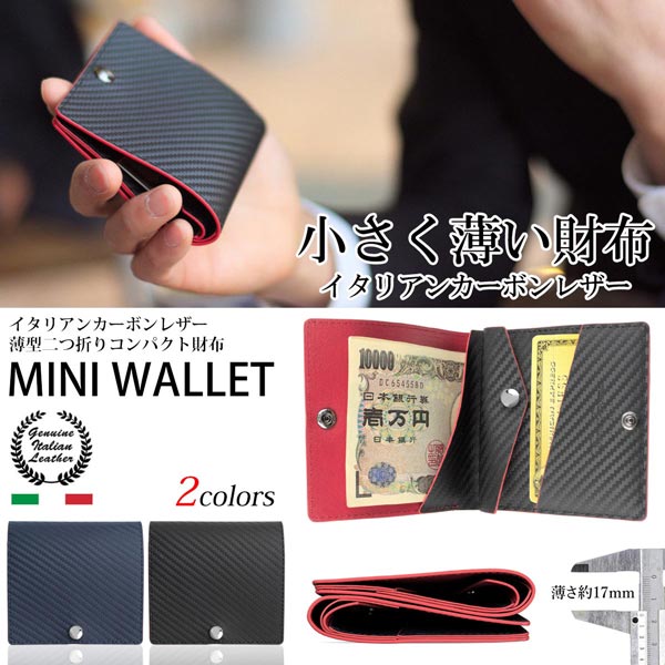 イタリアンカーボンレザー 牛革 二つ折り財布 メンズ レディース 薄型 コンパクト 小さい 財布 小銭入れ カードケース【送料無料】父の日 母の日 プレゼント ギフト