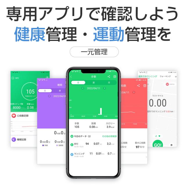 ■測定内容:心拍モニター、血圧、歩数、距離、移動ルート、消費カロリー、睡眠の質と時間及び日常生活のさまざまなシーンで測定ができます。また、リストバンド型の心拍計で自動的に継続測定して、消費カロリーを正確に記録で運動強度を維持し、トレーニング効果を最大化して、健康を最適化できます。基礎代謝や運動消費カロリーを正確に記録し、体重管理を支援します。簡単に健康管理ができ、日常生活をより豊かにしてくれます。スポーツ ウォッチ(ランニングやマラソン、ジョギング、フィットネス)としても活用!