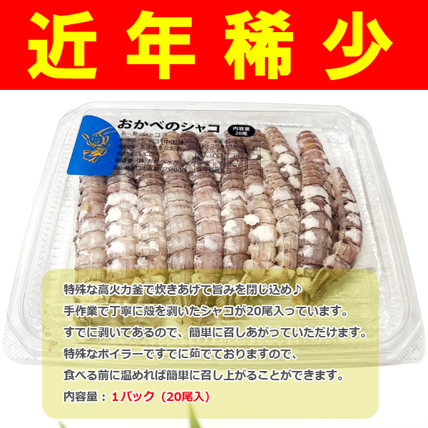 特殊な高火力釜で炊きあげて旨みを閉じ込め♪手作業で丁寧に殻を剥いたシャコが20尾前後入っています。すでに剥いてあるので、簡単に召しあがっていただけます。特殊なボイラーですでに茹でておりますので、食べる前に温めれば簡単に召し上がることができます。内容量:1パック(20尾前後入)【冷蔵便】冷凍便と同梱できません。