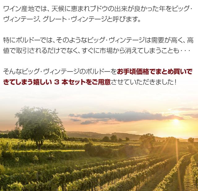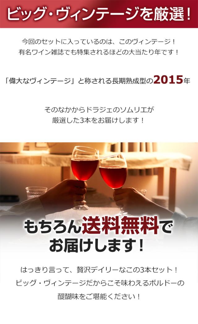 【送料無料】ワインセット 第98弾 2015年 ボルドー 当り年 3本セット ギフト プレゼント 赤ワイン ビッグ・ヴィンテージ ソムリエ厳選 御祝 誕生日 送別 記念品