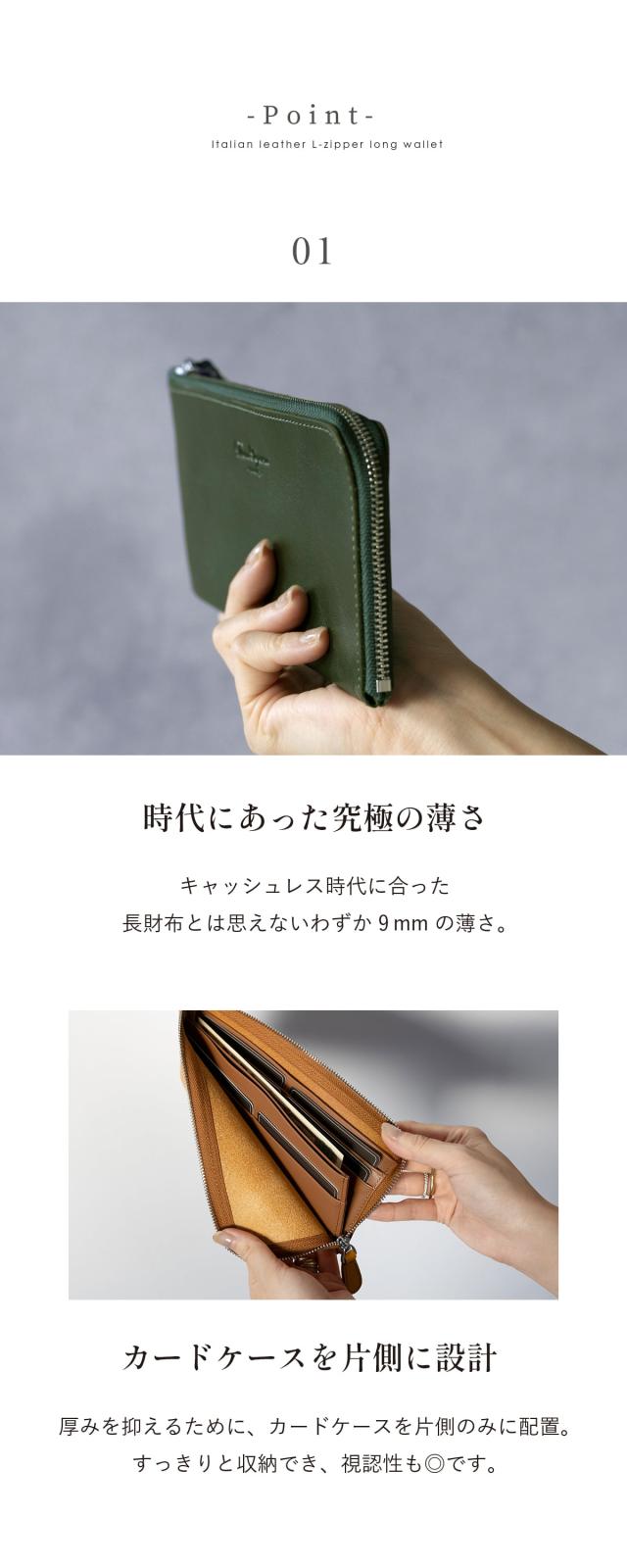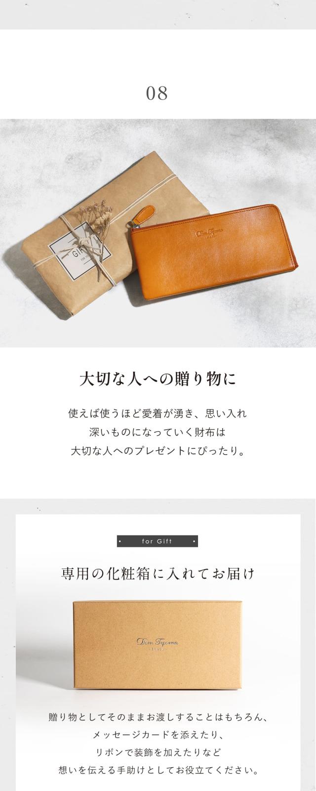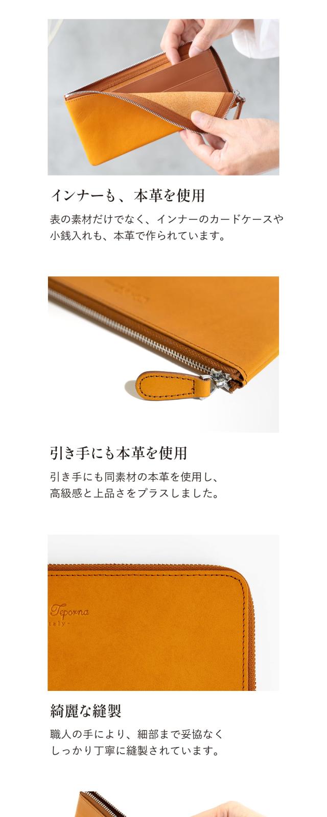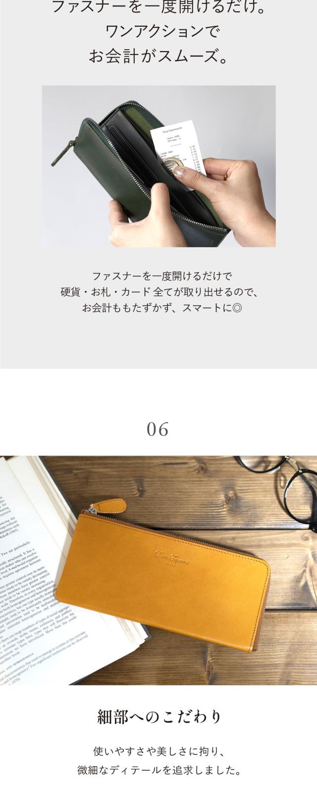 イタリア伝統のベジタブルタンニンなめしを施したイタリアンレザー。 艶かしいツヤと質感、香りで日常を彩る。 手にした瞬間から、オーナーと時を刻み始める、成長と変化を愉しめる。 そんなお財布です。 縫製、仕上げ、構造の追及は日々進化し続けるブランドであるDom Tepornaの技術を集約。 人気のL字ファスナーで薄型、さらに大容量。 内部の小銭入れスペースにはファスナーを使わずともコインが散らばることのない構造を採用。 ゴテゴテ感を取り払ったシンプルで使いやすいお財布です。 スムーズ開くファスナーはお札入れ、小銭入れに素早くアクセスし、お会計時にモタつかない。 パーツはひとつひとつアイテムと相性のいいものを。 もちろん品質はこだわりぬいたものを採用。 長く使えるシンプルで機能的なイタリアンレザーウォレットです。