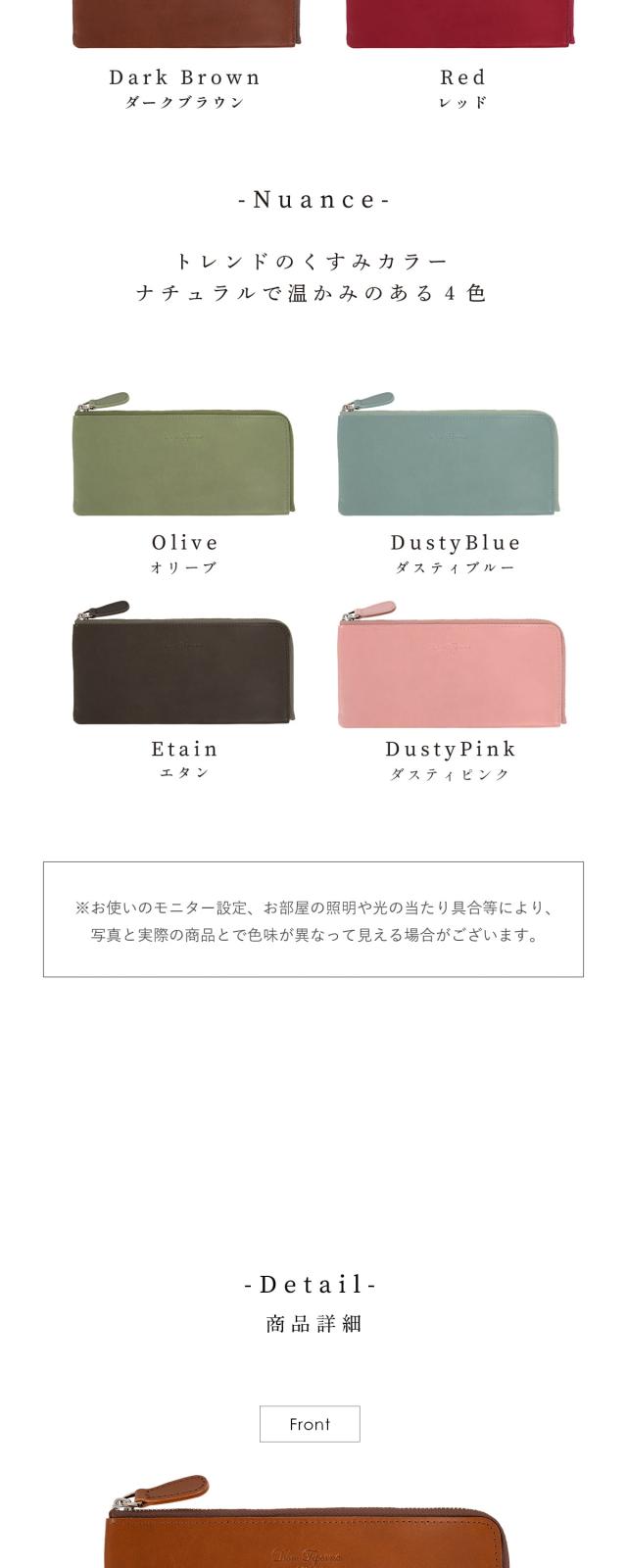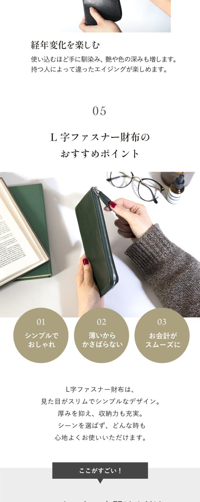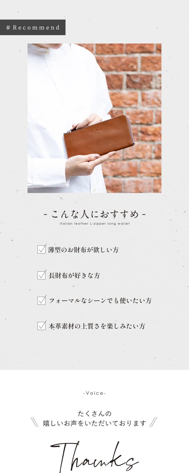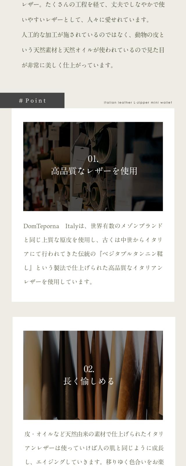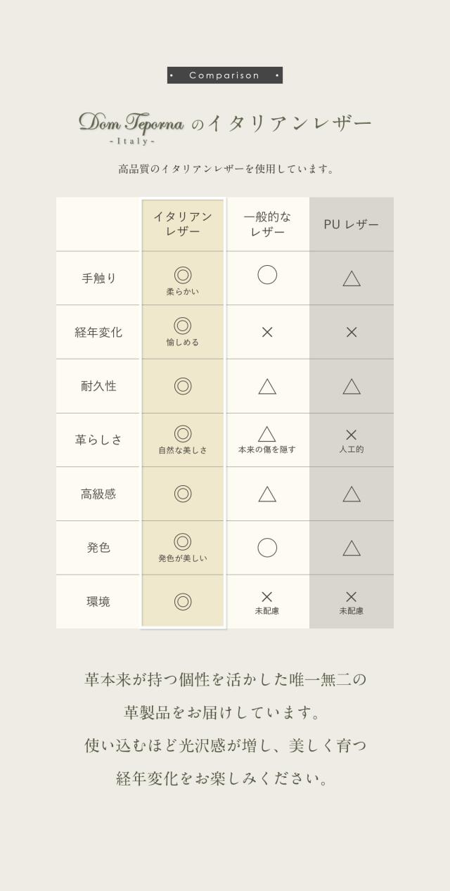 イタリア伝統のベジタブルタンニンなめしを施したイタリアンレザー。 艶かしいツヤと質感、香りで日常を彩る。 手にした瞬間から、オーナーと時を刻み始める、成長と変化を愉しめる。 そんなお財布です。 縫製、仕上げ、構造の追及は日々進化し続けるブランドであるDom Tepornaの技術を集約。 人気のL字ファスナーで薄型、さらに大容量。 内部の小銭入れスペースにはファスナーを使わずともコインが散らばることのない構造を採用。 ゴテゴテ感を取り払ったシンプルで使いやすいお財布です。 スムーズ開くファスナーはお札入れ、小銭入れに素早くアクセスし、お会計時にモタつかない。 パーツはひとつひとつアイテムと相性のいいものを。 もちろん品質はこだわりぬいたものを採用。 長く使えるシンプルで機能的なイタリアンレザーウォレットです。