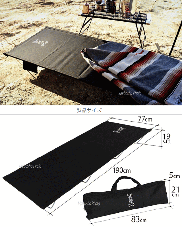 快眠できるゆったりサイズで目覚めもスッキリ。ワイドサイズのキャンピングベット(コット)。キャンプで朝までゆったり快適に寝たい。そんなあなたにおすすめのワイドなキャンプ用ベッド(コット)です。地面から浮いた状態で就寝できるので夏は涼しく冬は寒さを和らげます。地面の凸凹の影響も受けにくいためキャンプでの睡眠の質を向上させ朝までぐっすり眠る事ができます。■カラー:ブラック■サイズ約W77×D190×H19cm■収納サイズ約W21×D83×H5cm■重量約4.4kg(付属品含む)■静止耐荷重量100kg※耐荷重量は測定値であって保証値ではありません。ベッドにかかる重量は乗り方や速度によっても変わりますのであくまで目安としてご検討下さい。■材質[フレーム]スチール[ベッド本体]ポリエステル(PVC コーティング)■セット内容:キャンピングベッド生地本体、脚部フレーム×4本、メインフレーム(中央部)×2本、メインフレーム(端部)×2本、キャリーバッグ