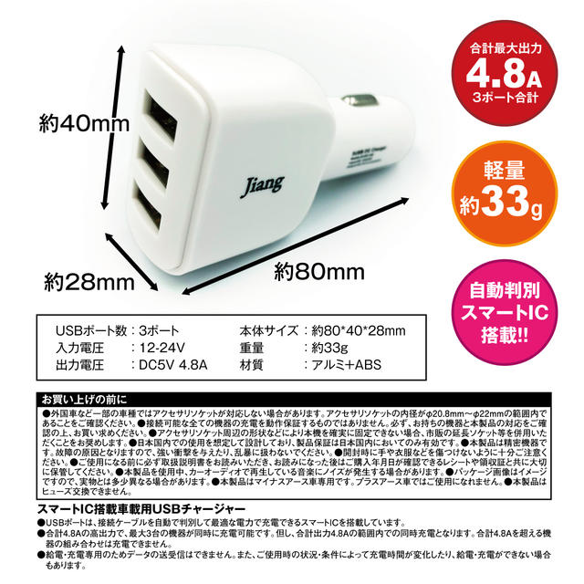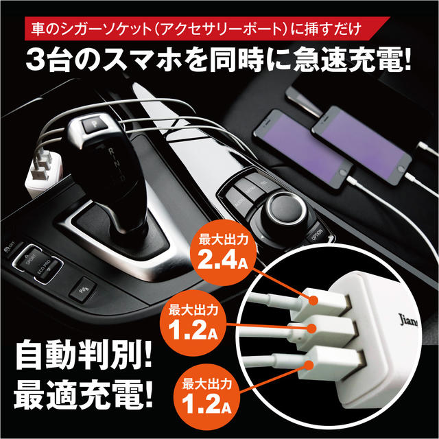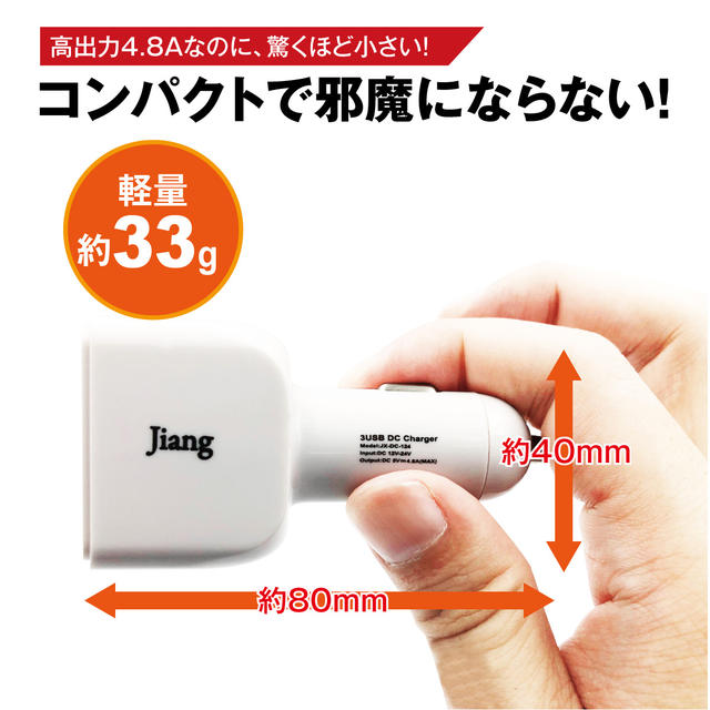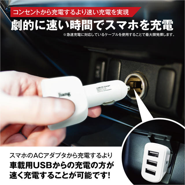 カーチャージャー シガーソケット USB 急速充電 3ポート 4.8A 車載用 車 充電器 チャージャー USBカーチャージャー jiang-car01