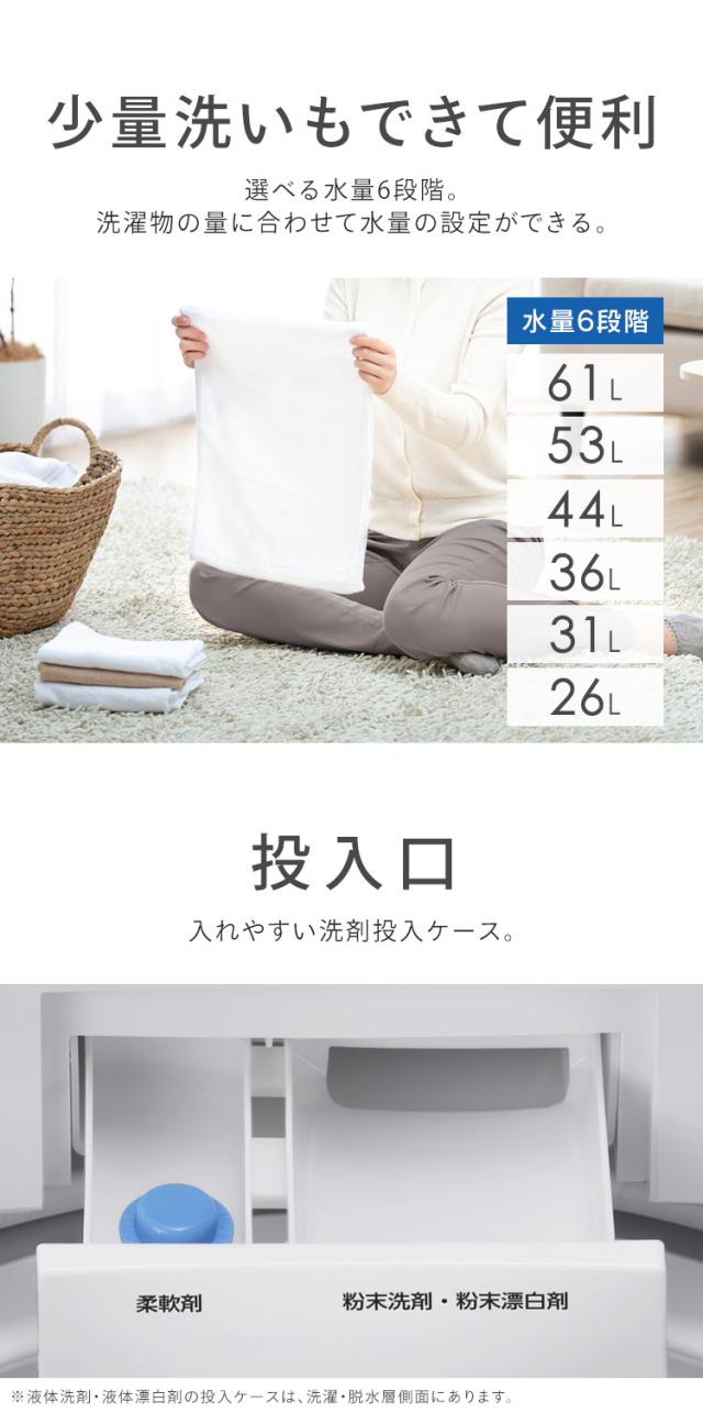 洗濯物の量に合わせて水位設定(61L、53L、44L、36L、31L、26L)ができます。