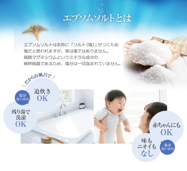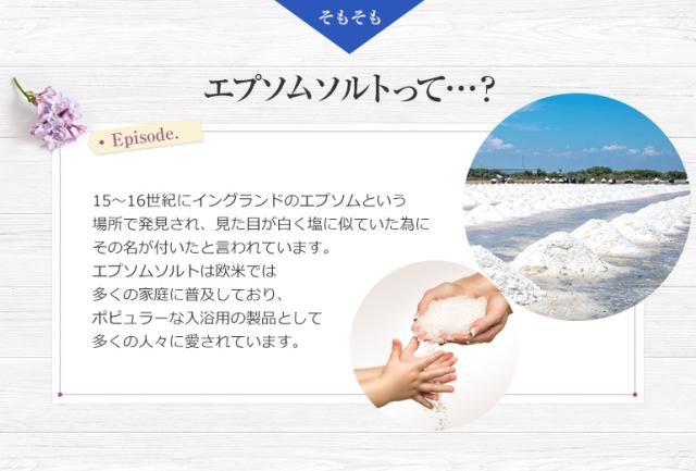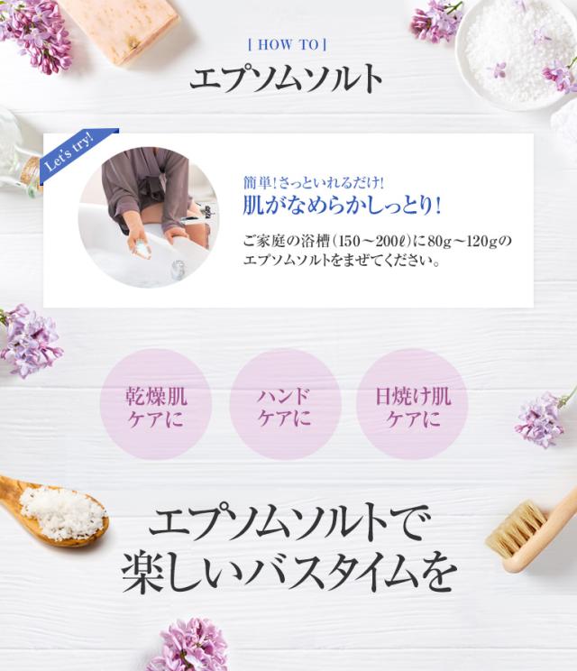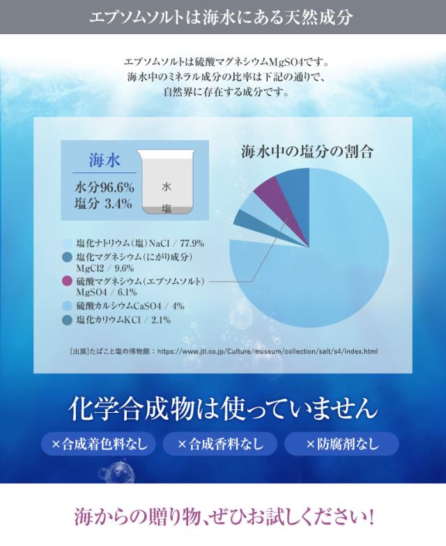 【特徴】エプソムソルトは海水に含まれるミネラル成分の硫酸マグネシウムが結晶化したものです。粒子がまるで塩のように見えることから【エプソムソルト】と名付けられましたが、これは塩ではありません。塩分が含まれないため、風呂釜や浴槽を傷めずに使用できます。ゆっくり浸かってミネラル成分を浸透させてください。