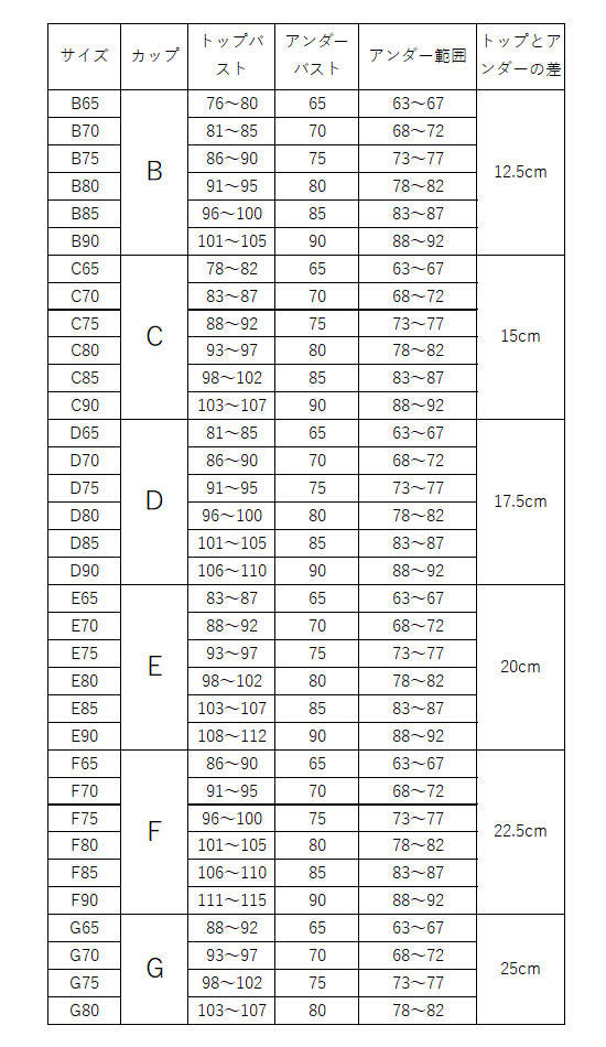 国産だからできたカップサイズB/C/D/E/Fの計5サイズ、アンダーバスト65/70/75/80の計4サイズ合計20サイズ展開。ほとんどの方のサイズに対応できるかと思います。
