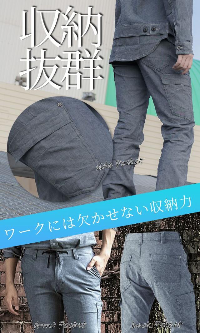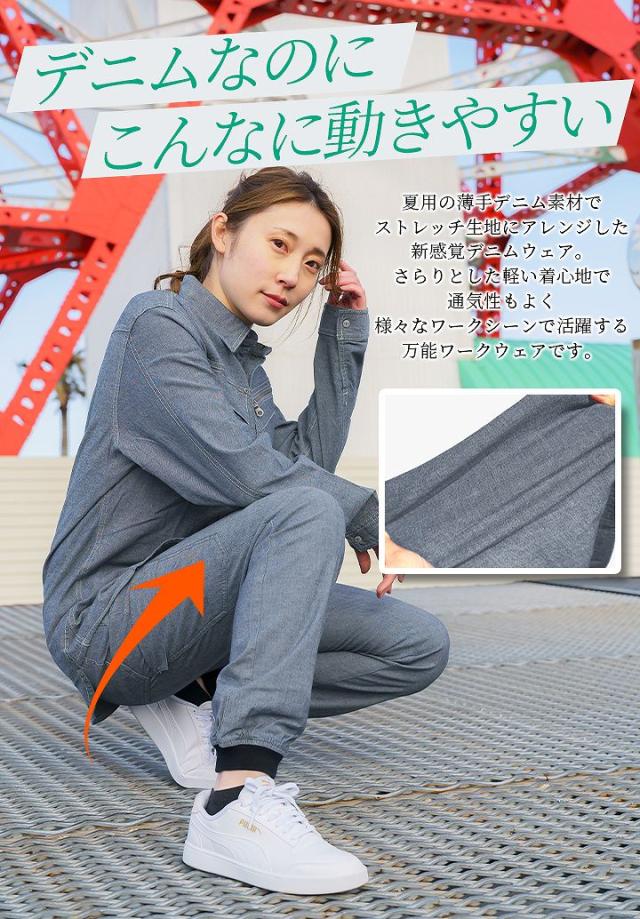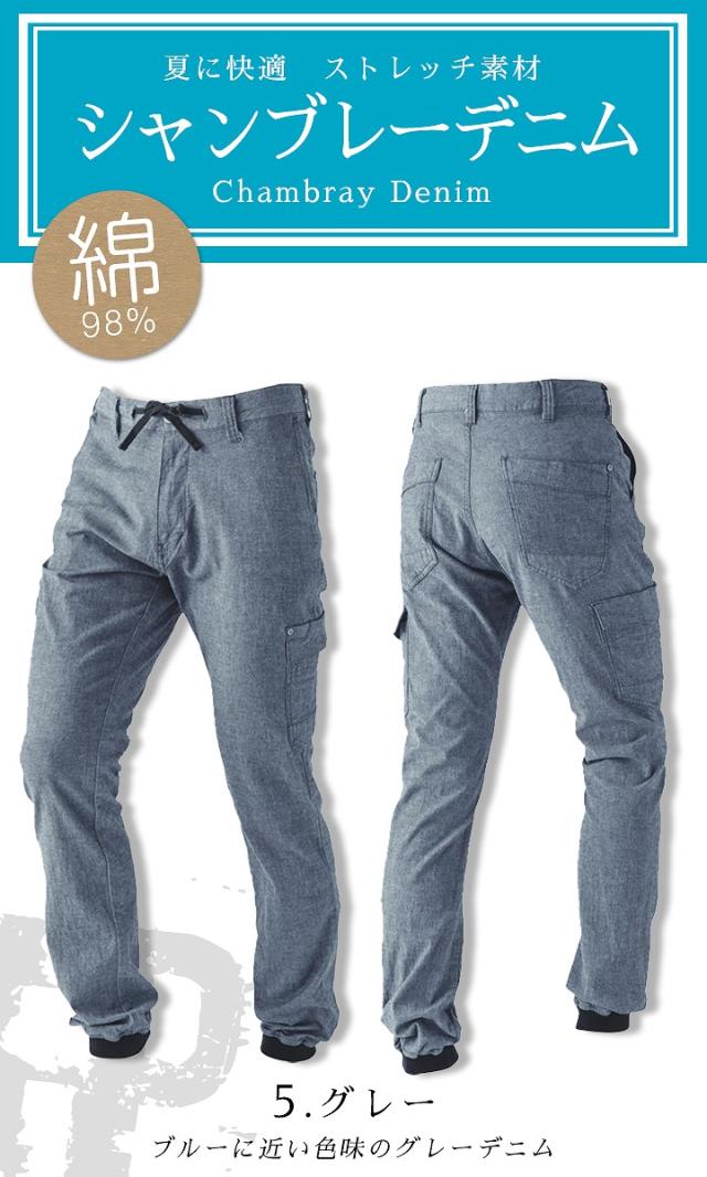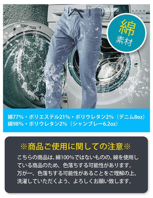【ほぼ半額値下げです!】春夏用 綿素材 ストレッチシャンブレー生地だから気心地がいい!。様々なワークシーンに対応!シャンブレーとデニムのストレッチジョガーパンツ
