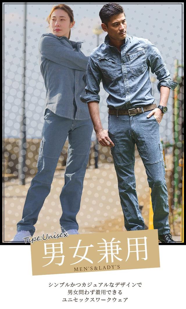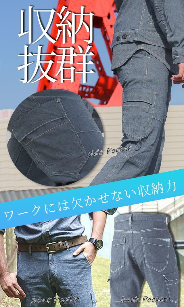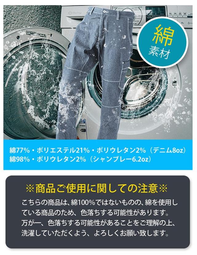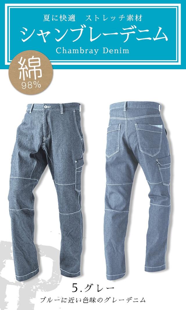 【ほぼ半額値下げです!】春夏用 綿素材 ストレッチシャンブレー生地だから気心地がいい!。様々なワークシーンに対応!シャンブレーとデニムのストレッチカーゴ
