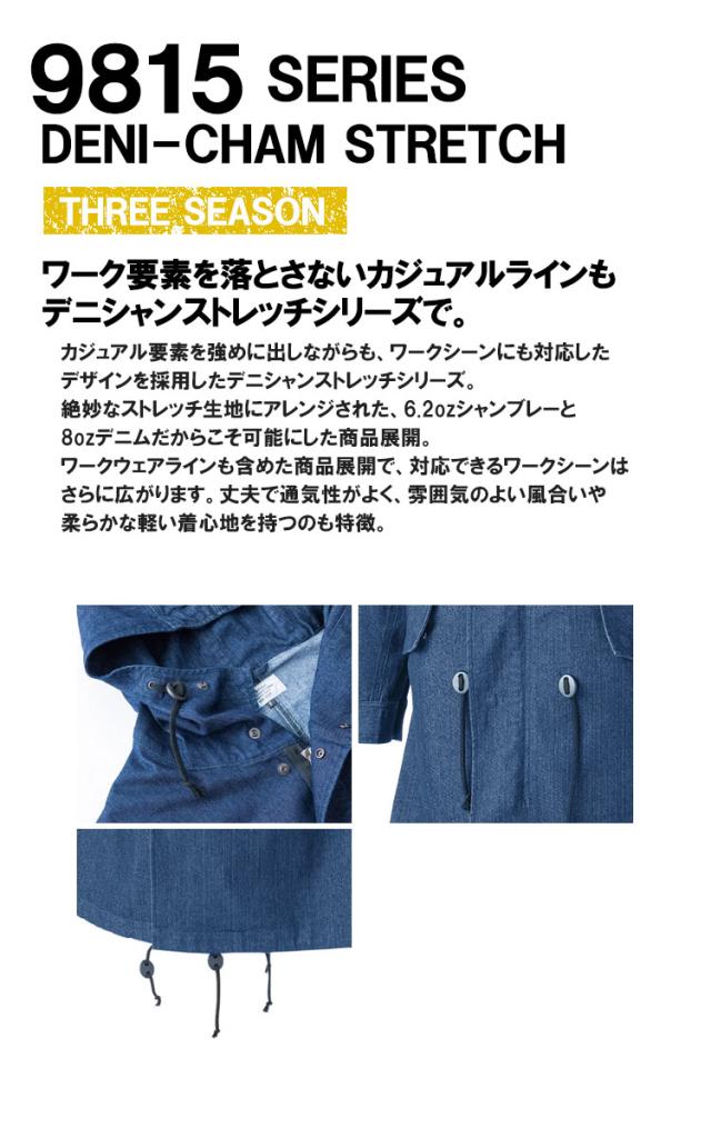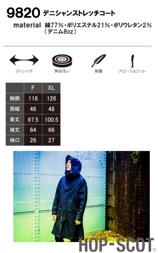 コート 9820 ストレッチ 軽量 フード付き デニム シャンブレー デニシャンストレッチコート HOP-SCOT 作業服 作業着 中国産業 F XL 9815シリーズ