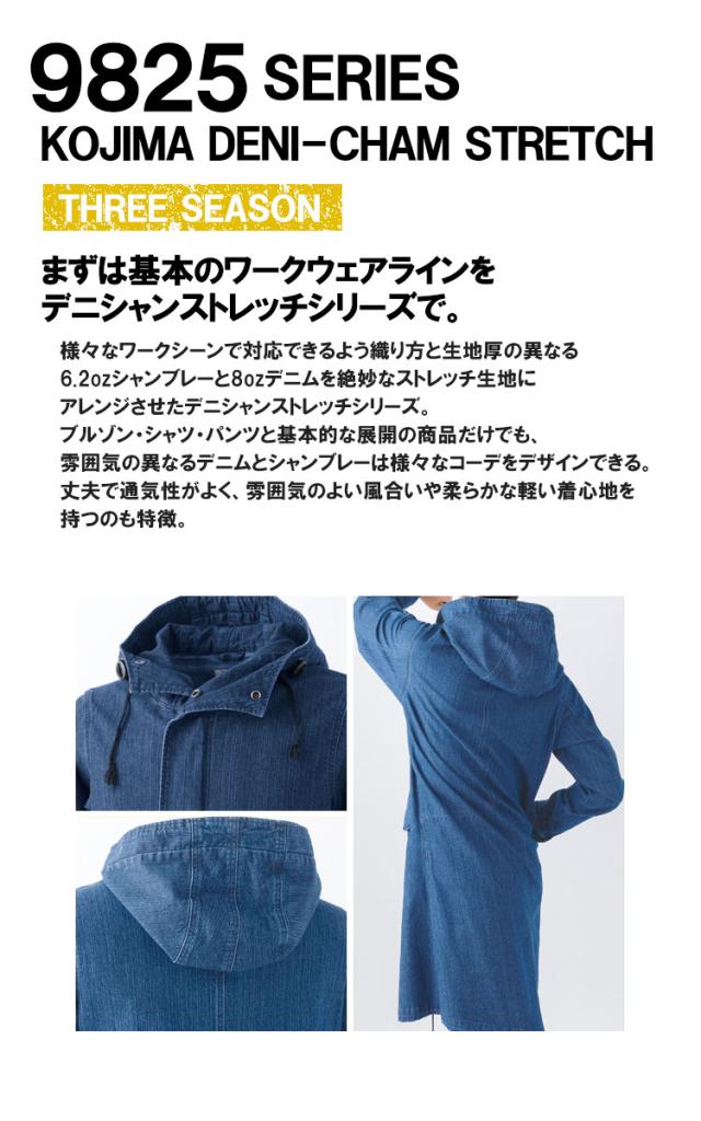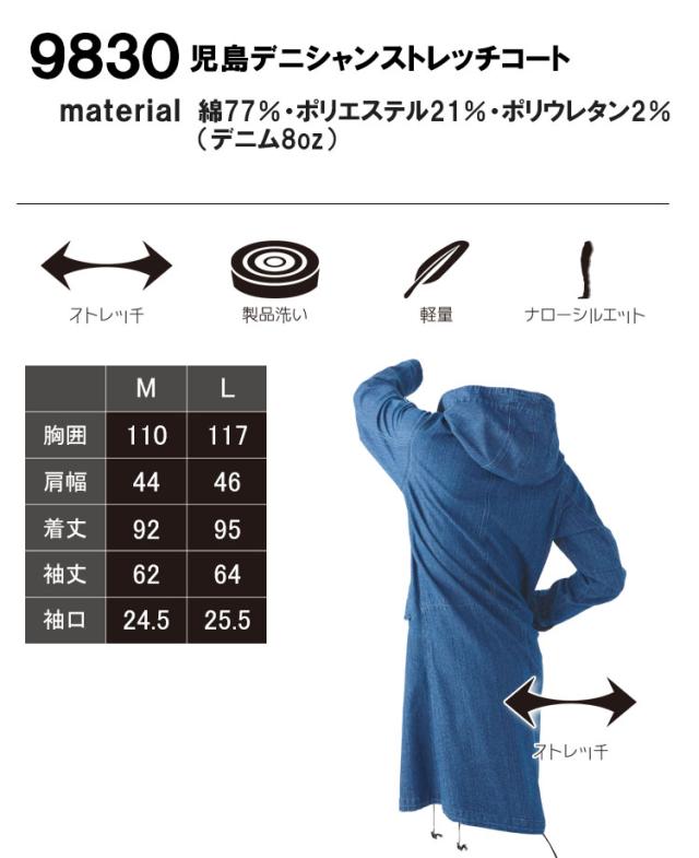 コート 9830 ストレッチ 軽量 デニム 児島デニシャンストレッチコート HOP-SCOT 作業服 作業着 中国産業 F-XL 9825シリーズ