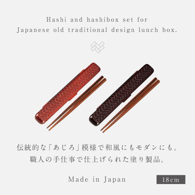 箸,18cm,箸箱,セット,箸箱セット,弁当用,お箸,箸ケース,カトラリー,ケース,女子,女性,レディース,男子,メンズ,男性,日本製,大人,学生,中学生,高校生,和風,和柄,和,和モダン,シンプル,レトロ,スタイリッシュ,HAKOYA,弁当,お弁当,お弁当アイテム,ランチグッズ,グッズ,通勤,会社,通学,学校,昼食,お弁当作り,あじろ,網代,模様,赤,朱,溜,茶,お洒落,オシャレ,BPAフリー,安心,安全,