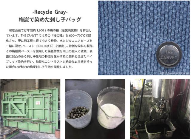 和歌山県の名物である梅、梅干しやお菓子など多くの名産品ができると同時に、不可食部である種が廃棄物として多く排出されています。その梅の種の再資源化をThe Canvetは考えました。炭化させた梅の種をもとに特別な染料を製作、それを使用した染色作業を岡山の職人に依頼。表面に凹凸のある刺し子生地の特徴を生かす為に顔料と混ぜたハイブリッド染色を行い 独特な風合いが魅力の梅炭刺し子生地が誕生しました。