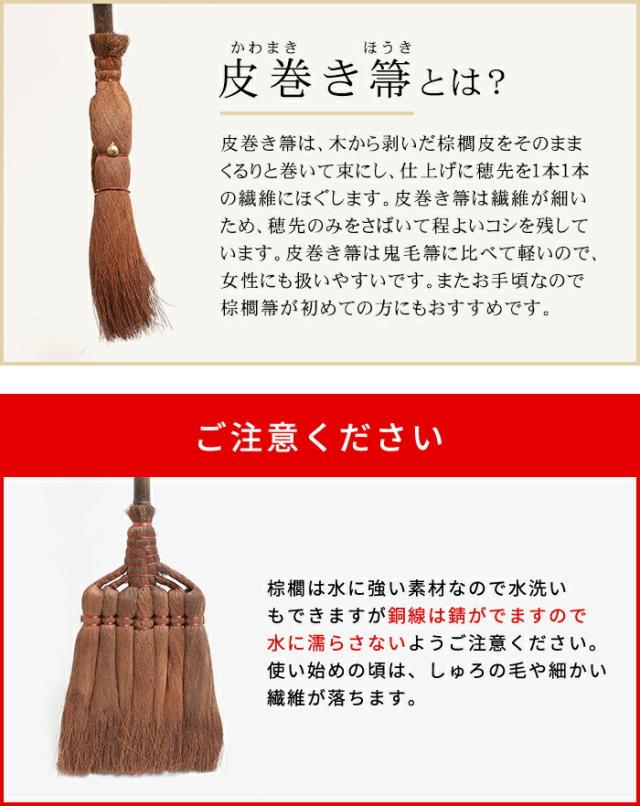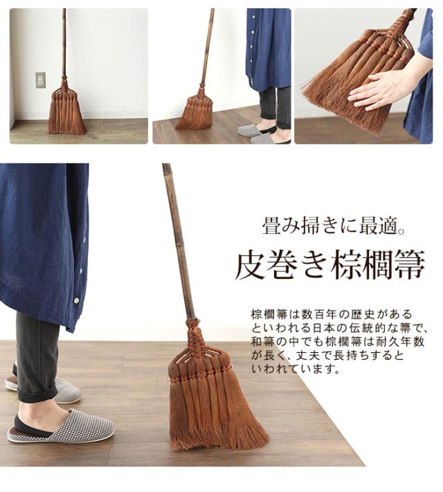 | 畳み掃に最適。和歌山県 紀州伝統デザイン皮巻き棕櫚箒。 棕櫚箒は数百年の歴史があるといわれる日本の伝統的な箒で、和箒の中でも棕櫚箒は耐久年数が長く、丈夫で長持ちするといわれています。 人目に触れても見苦しくないので、いつでも気軽に手にとれる場所に吊るして置けます。 電気掃除機のようにとは違ってエコで音も静かな棕櫚箒。 畳にもフローリングにも適した箒です。 棕櫚(シュロ)とは 里山では普通に見ることのできるヤシ科の常緑植物です。 幹の周りの皮を編んで作られる棕櫚縄、棕櫚マットなどがあるように繊維はしなやかで非常に丈夫です。 タワシ等にも使われる素材ですから水にも強いという特徴を持っています。 皮巻き箒は、木から剥いだ棕櫚皮をそのままくるりと巻いて束にし、仕上げに穂先を 1本1本の繊維にほぐします。 皮巻き箒は繊維が細いため、穂先のみをさばいて程よいコシを残しています。 皮巻き箒は鬼毛箒に比べて軽いので、女性にも扱いやすいです。 またお手頃なので棕櫚箒が初めての方にもおすすめです。 棕櫚は水に強い素材なので水洗いもできますが銅線は錆がでますので水に濡らさないようご注意ください。 使い始めの頃は、しゅろの毛や細かい繊維が落ちます。 |