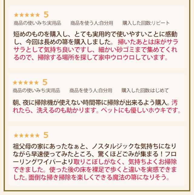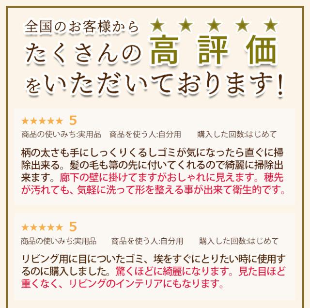 - ちょっと掃除したい時などに便利。 巾木の埃とりにもかがまなくて良いので重宝してます。 昔懐かしのほうき、部屋のインテリアにもなり 買って良かったです。