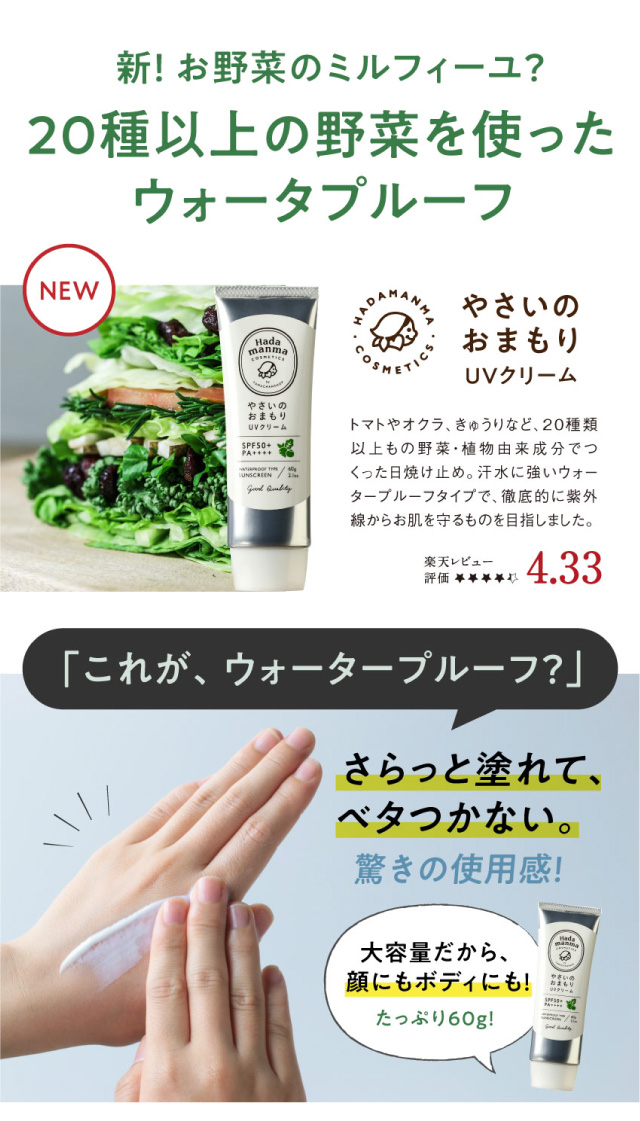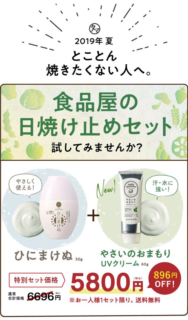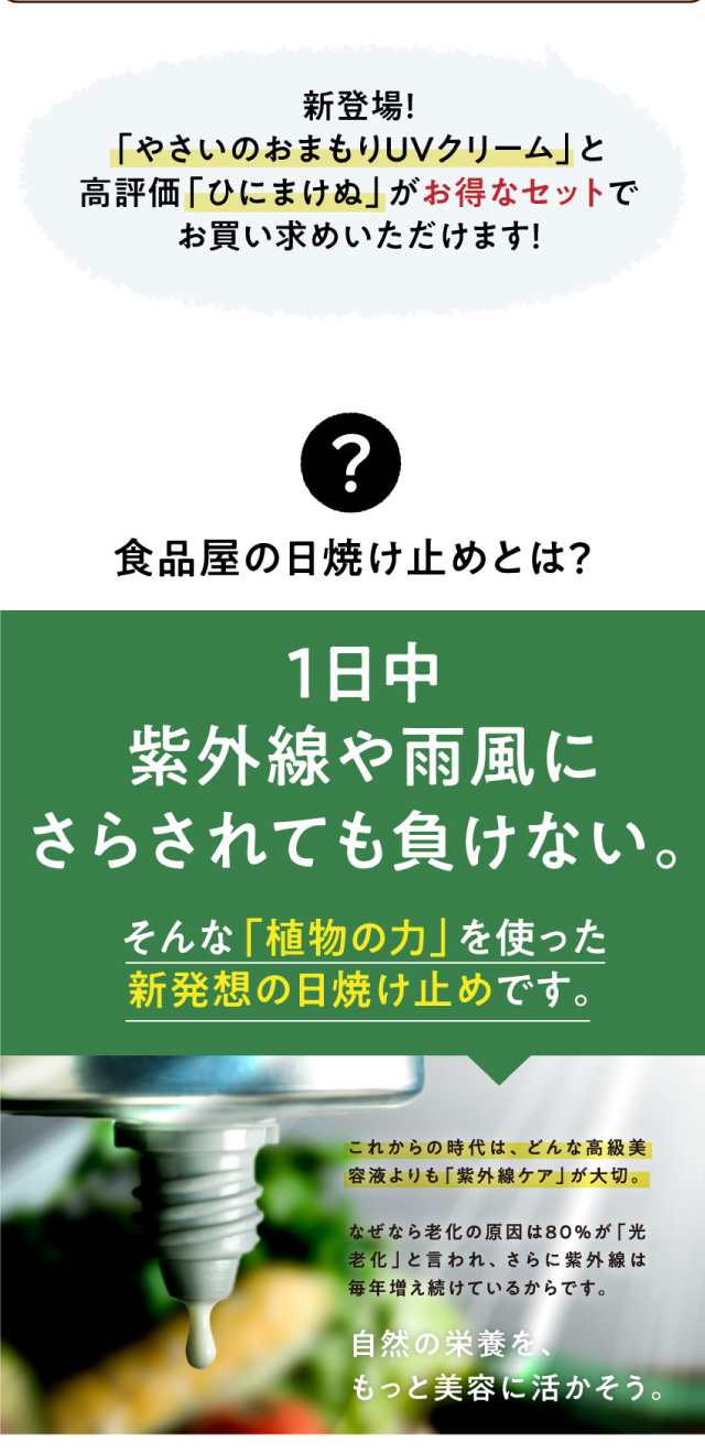食べ物の力で出来た、肌に優しい日焼け止め。シルクベールで刺激物質からも肌を守る「ひにまけぬ」と、20種類以上もの野菜・植物由来成分で作ったウォータープルーフタイプの「やさいのおまもりUVクリーム」がセットに!