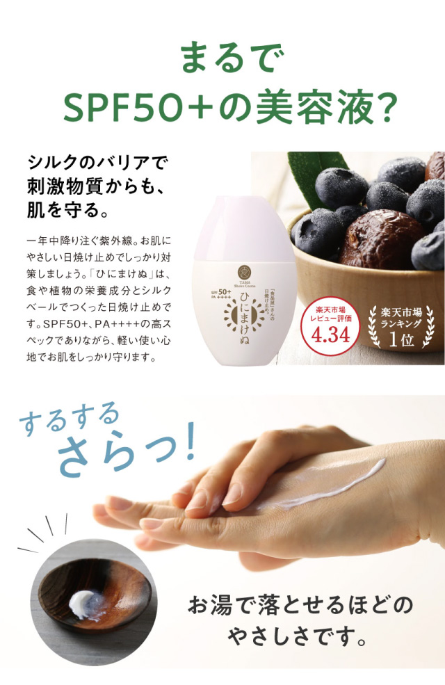 - ひにまけぬ、は実店舗で購入したことがありリピートです。ボディソープで落とせること、コンパクトなので持ち運びしやすいこと、ベタベタしないし容器のカタチも可愛いです。 紫外線が強いところではフタの色が変わ...