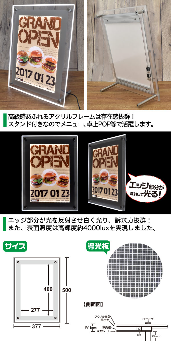 広告やディスプレイにオススメ! アクリルフレームLEDライティングボード。 内装、展示会、ウエルカムボード等幅広い用途で活躍します。スタンド付きなのでメニュー、卓上POP等に便利です。 省電力、長寿命のLEDを使用。また、高級感あふれるアクリルフレームを採用しています。イメージ部分以外にもエッジ部分が光を反射させ白く光るので、訴求力抜群です。