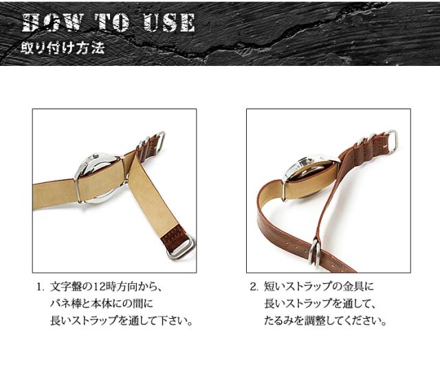 1:文字盤の12時方向から、バネ棒と本体にの間に長いストラップを通して下さい。