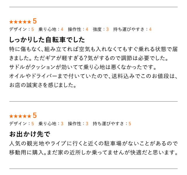 - 口コミの良さと子どもが自転車屋さんに勤めていた時に21テクノロジーさんの自転車を販売していたと聞き 信用があるなと思い購入を決めました。ギアの調整は必要でしたが 組み立ても簡単でとても良かったです。