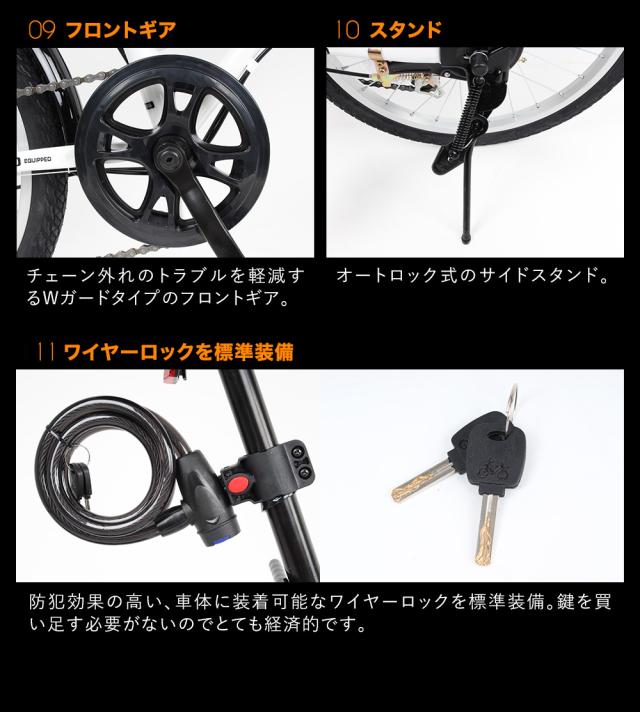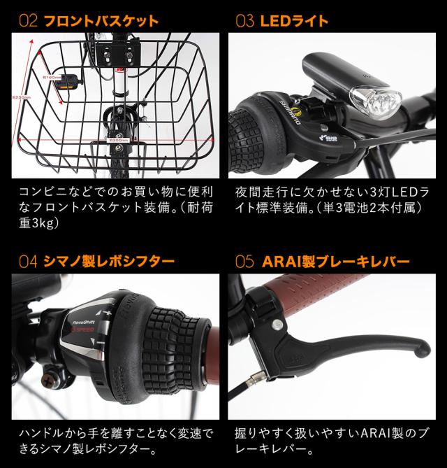【装備】反射板、片足スタンド、ワイヤーロック、ベル、3灯LEDライト、カゴ
