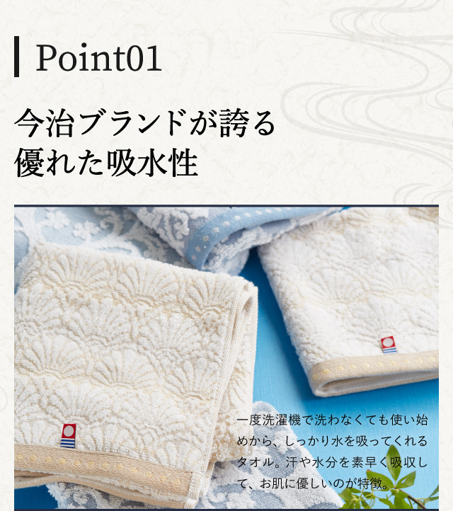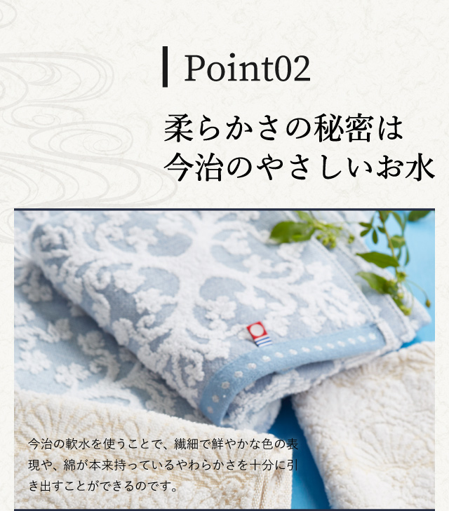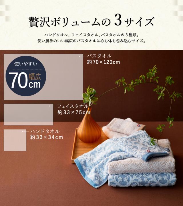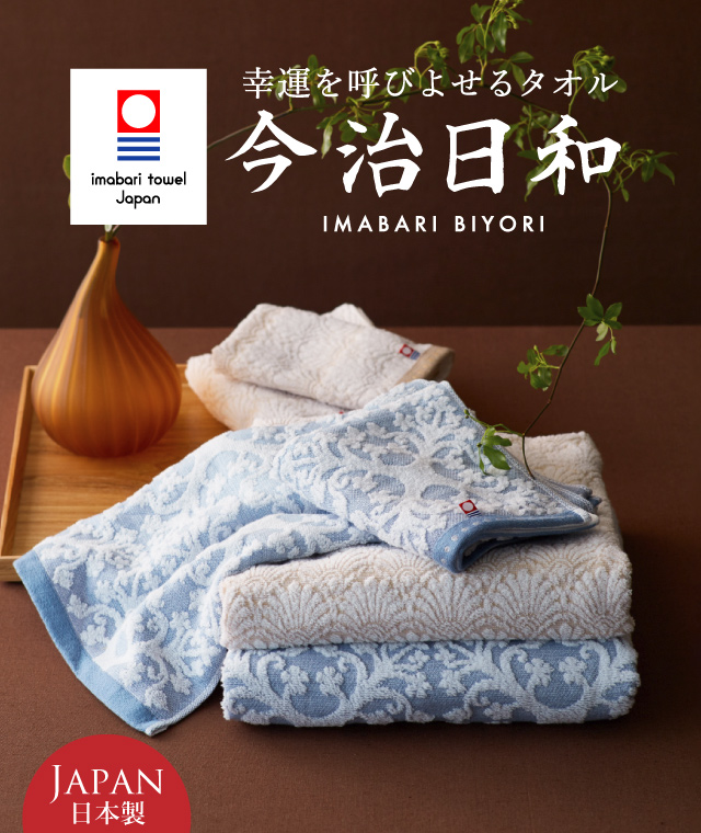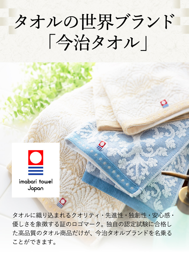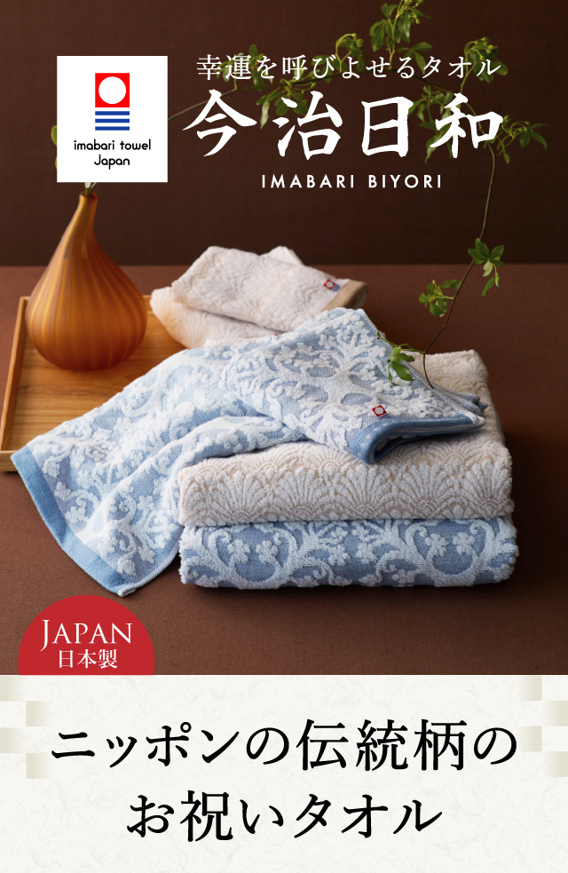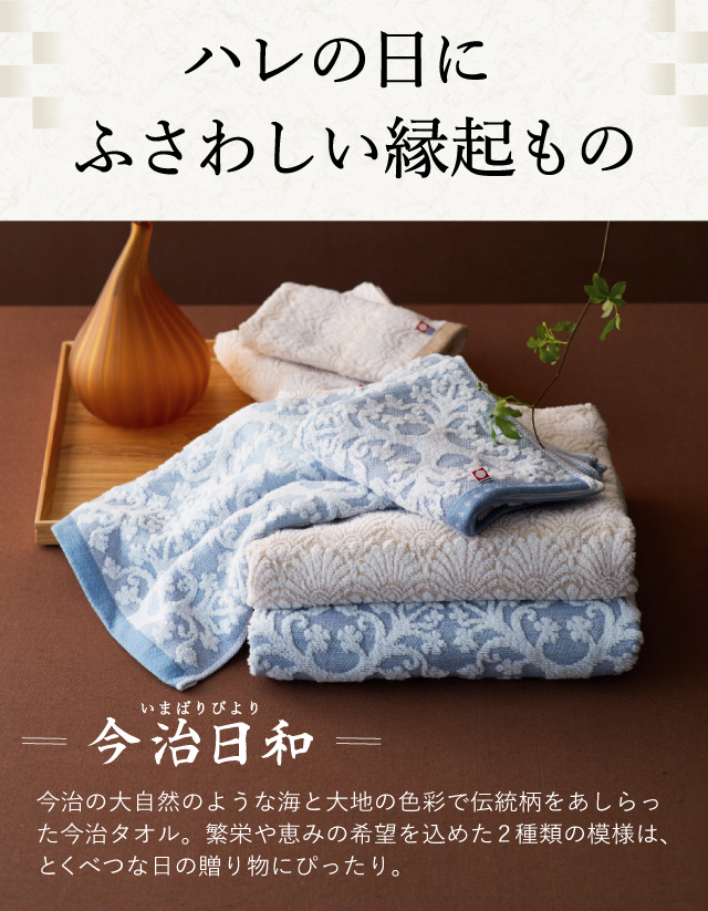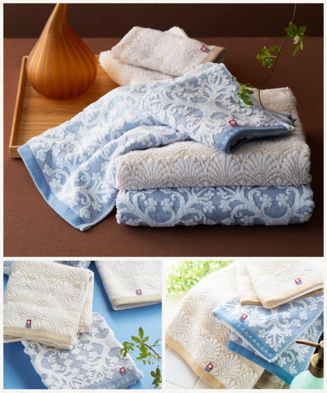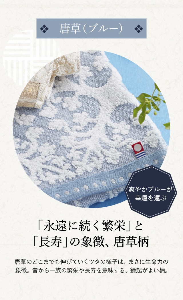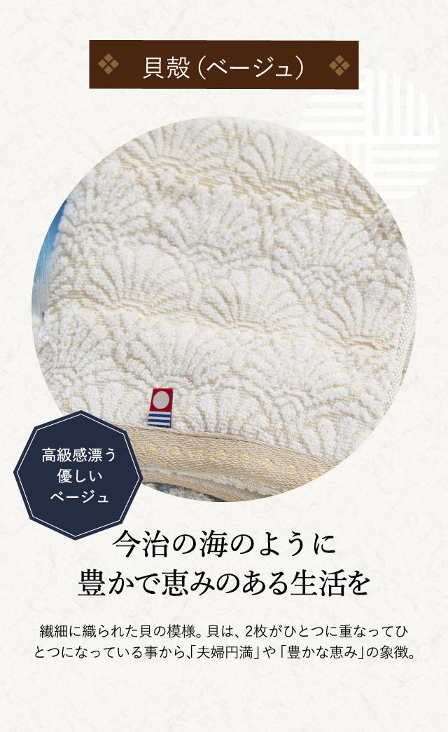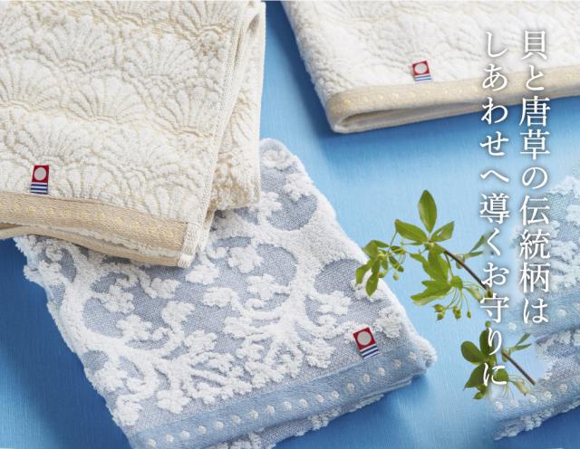 愛媛県今治の大自然を思わせる海と大地の色彩で伝統柄をあしらったタオル。「永遠に続く繁栄」「長寿」を意味する唐草模様と「豊かさと恵み」の象徴とされる貝の模様が織られたタオルは、還暦祝いや結婚祝いのとくべつな日の贈り物としてぴったり。使い続けるほどに品質の良さを実感できるタオルです。タオルと同様に、貝と唐草模様で彩られた上品なギフトボックスでお届け。