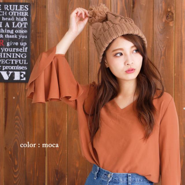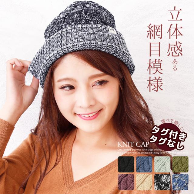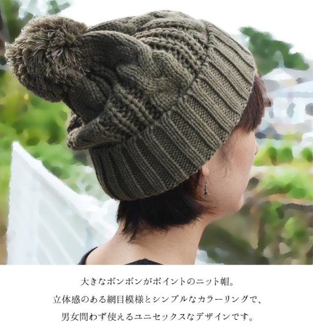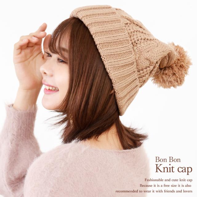 立体感のある網目模様とボンボンがかわいいニット帽!