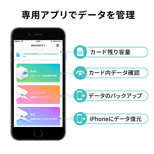 専用アプリ「Qubii」を使って、バックアップしたデータを管理できます。データをバックアップしておけば、iPhoneにトラブルが起こった時も、思い出の写真・動画を失わずに済みます。また、新しいiPhoneに買い替えた時のデータ移行もスムーズに行えます。