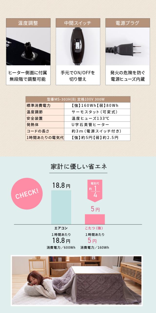 目盛り (弱)1時間あたりの標準消費電力量 約80Wh安全装置 温度ヒューズ133℃