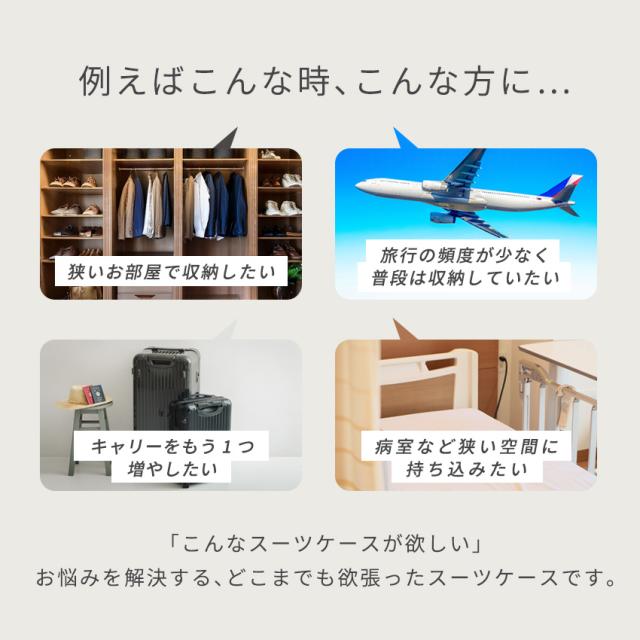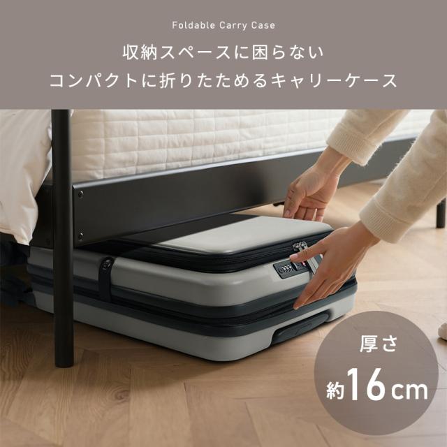 | 【畳んで小さく収納】 厚さ約23cmのキャリーケースが、折りたたんで厚さわずか約16cmの薄さに大変身。 使わないときはクローゼットの隅や、家具の隙間などにスッと収納。 |