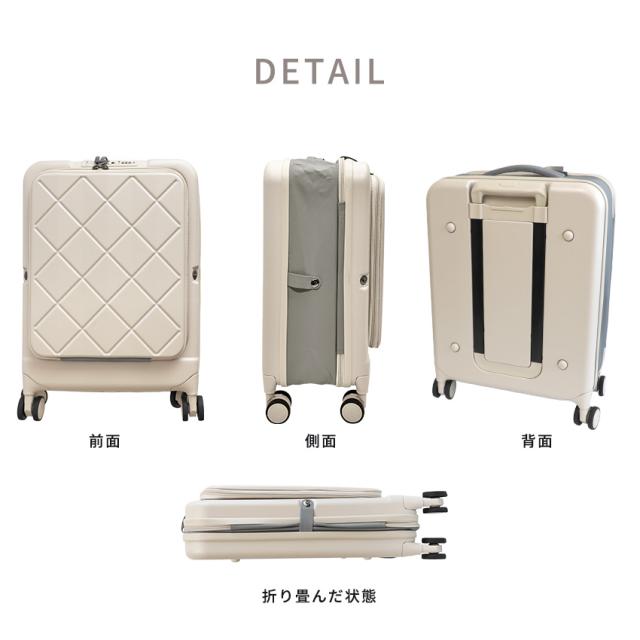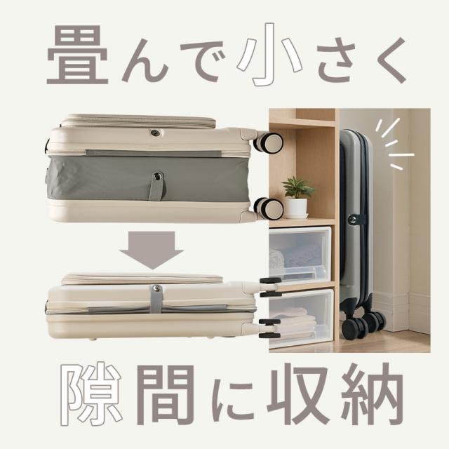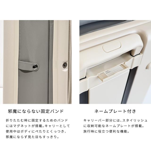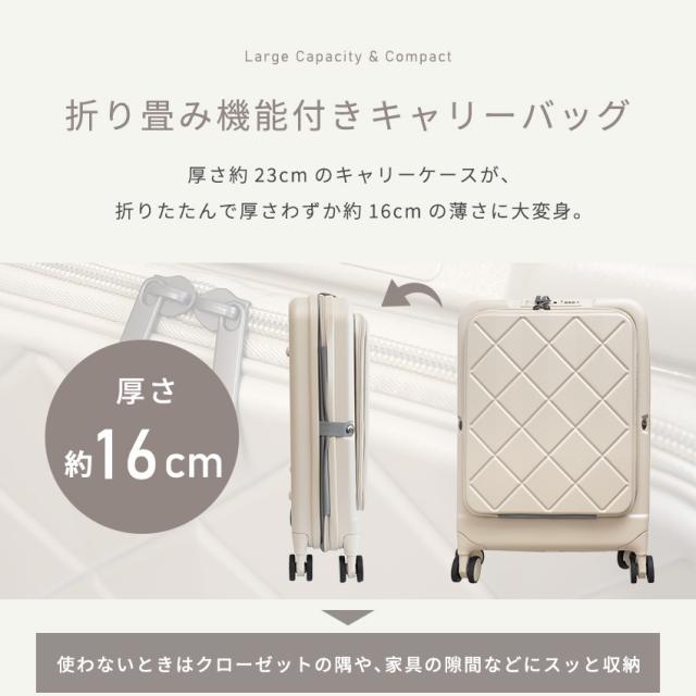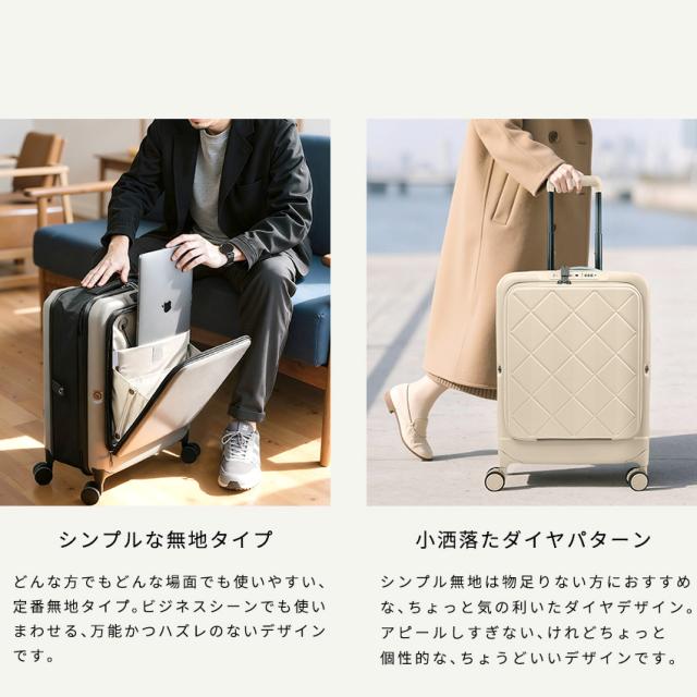 | 【フロントオープン+折りたたみ】 利便性を詰め込んだ機能美キャリーケース。 機内持ち込み可能な42サイズで、1〜3泊の旅行にぴったりです。 |
