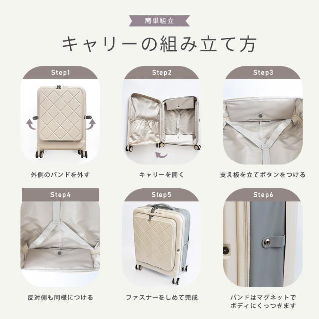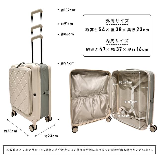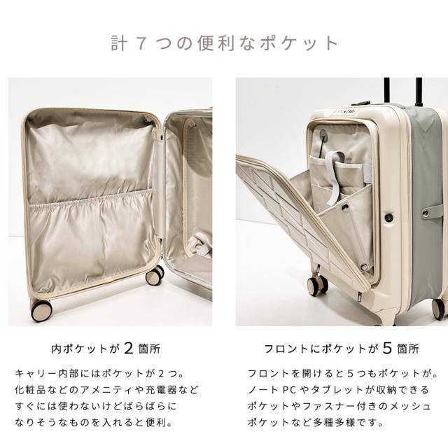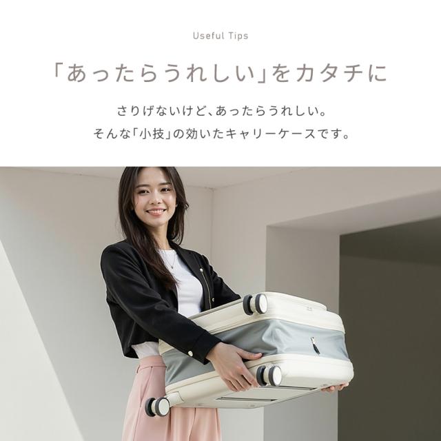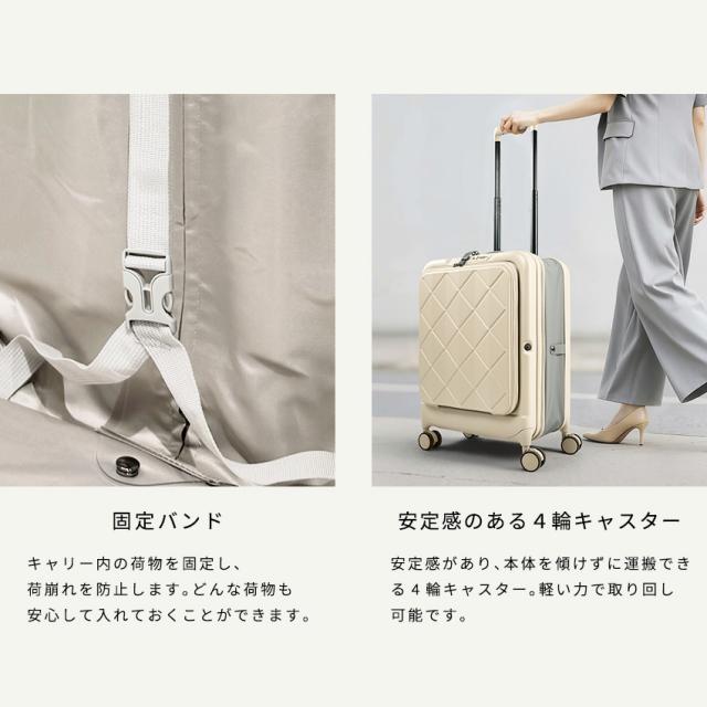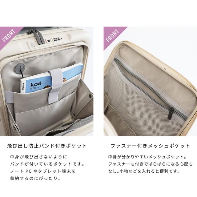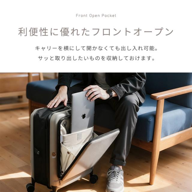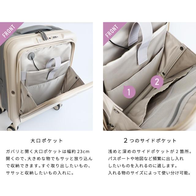 | 【利便性に優れたフロントオープン】 キャリーを横にして開かなくても出し入れ可能。サッと取り出したいものを収納しておけます。 |