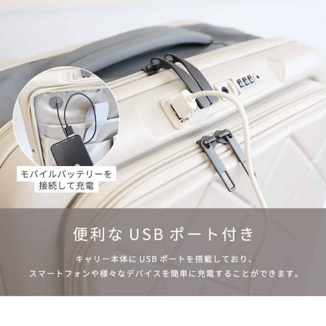 | 【便利なUSBポート付き】 キャリー本体にUSBポートを搭載しており、スマートフォンや様々なデバイスを簡単に充電することができます。 |