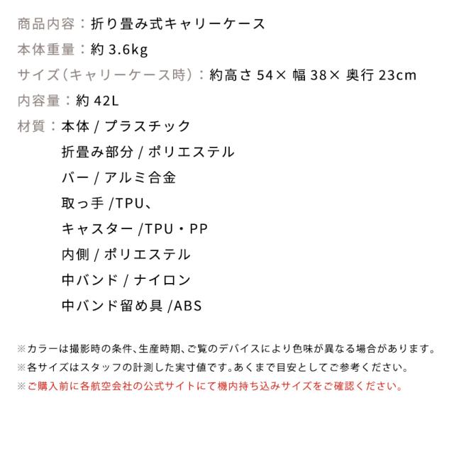 | 製品名:折り畳み式キャリーケース 品番:lff-foldingbag 本体重量:約3.6kg サイズ(キャリーケース時):約高さ54×幅38×奥行23cm 内容量:約42L 充電規格:USB Type-C 材質:本体:プラスチック 折畳み部分:ポリエステル バー:アルミ合金 取っ手:TPU キャスター:TPU・PP 内側:ポリエステル 中バンド:ナイロン 中バンド留め具:ABS |