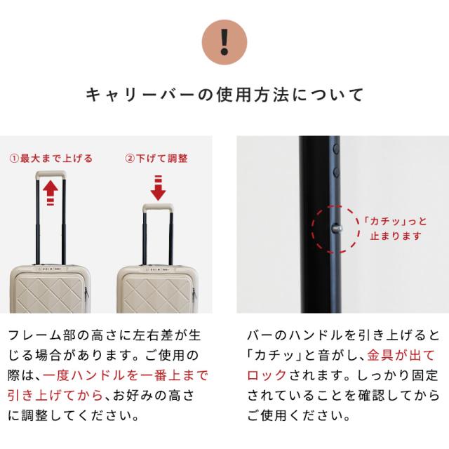 | 【サイズ調節ができるバー】 キャリーバーは簡単ワンプッシュ操作で伸縮。 荷物が多い時や片手がふさがっているときでも簡単に調整できます。 キャリーバー部分には、スタイリッシュに収納可能なネームプレートが搭載。 旅行時に役立つ便利な機能。 |